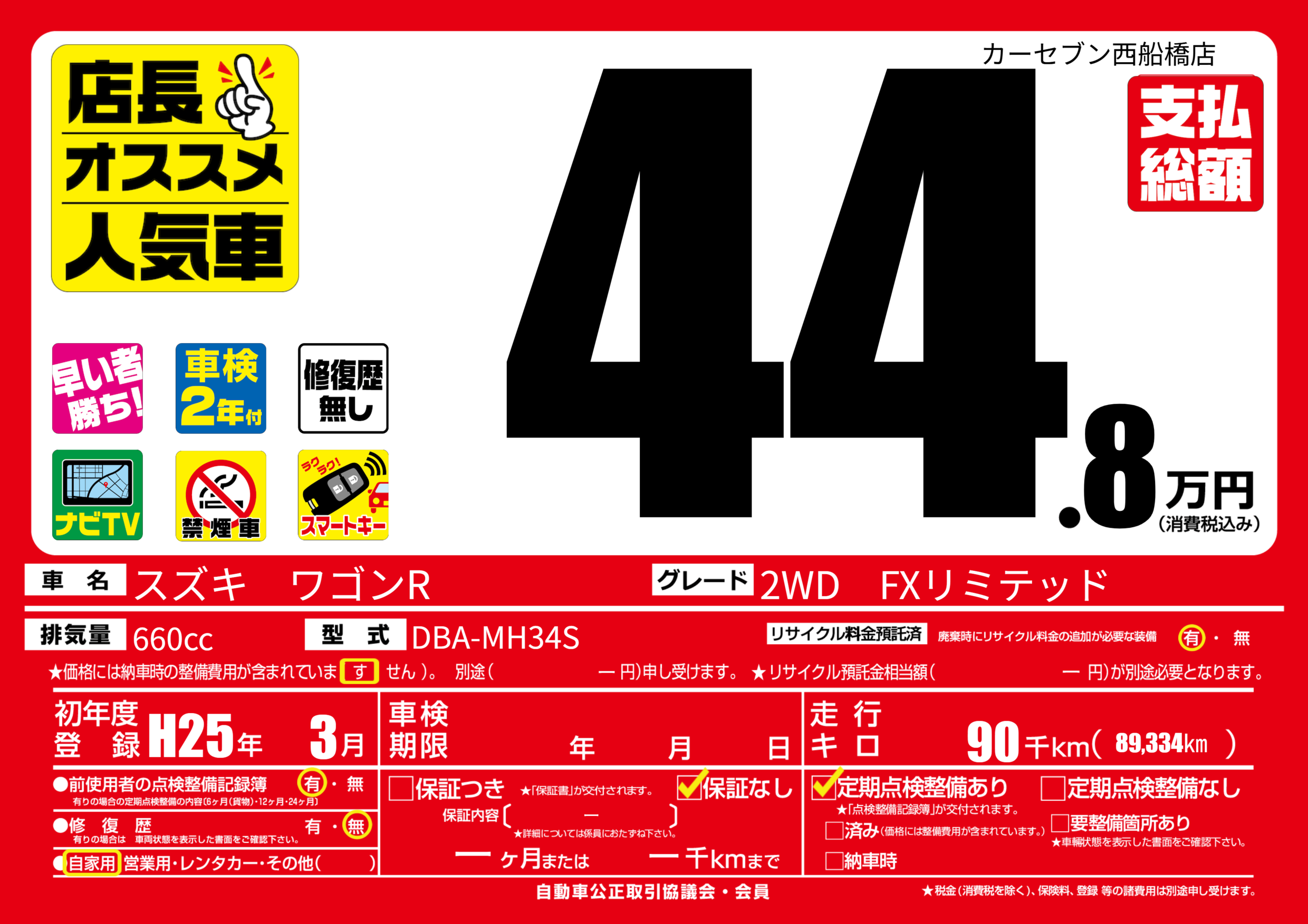 | 走行キロ | 9万km | 初年度登録 | H25年3月 |