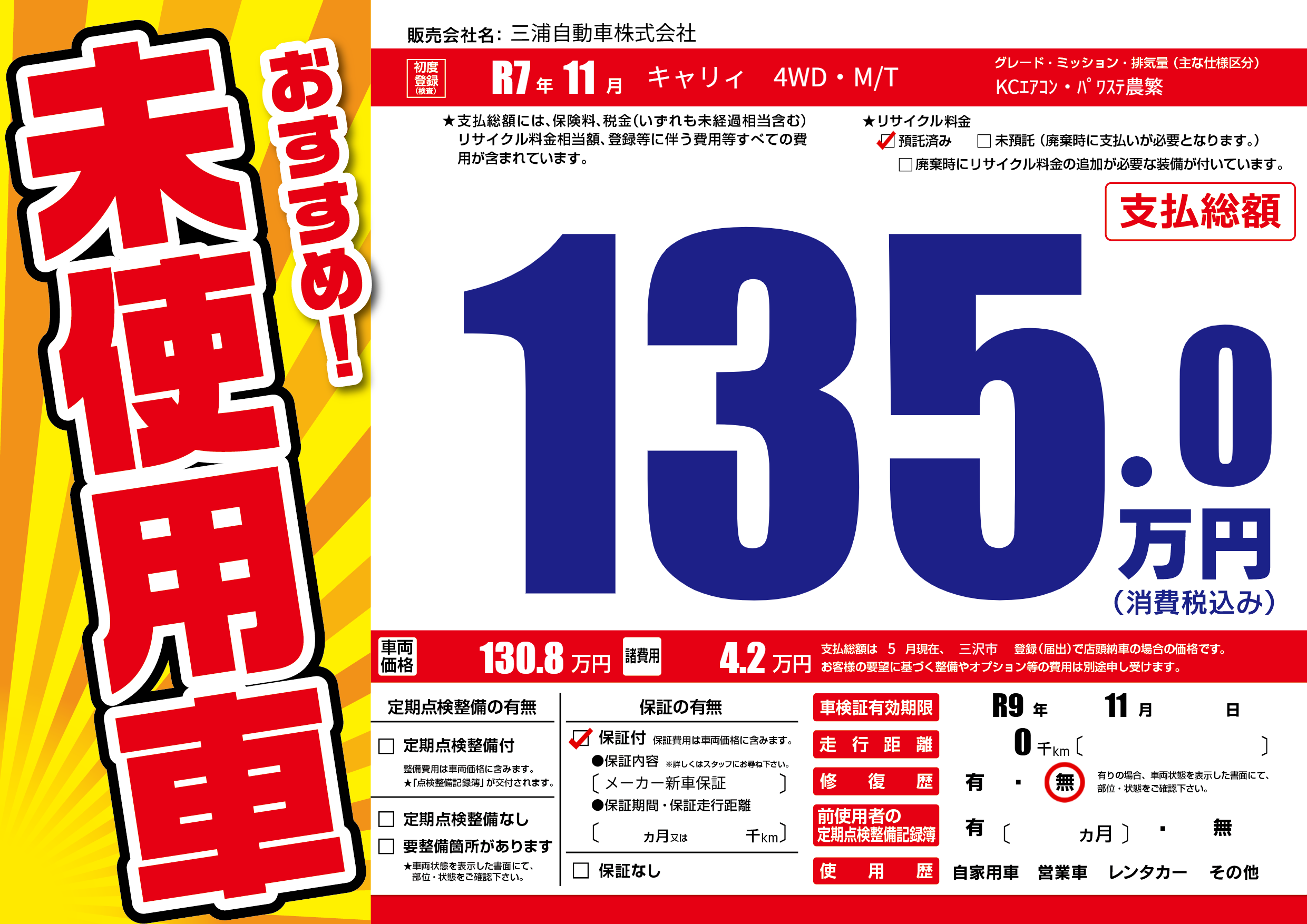 | 走行キロ | - | 初年度登録 | R7年11月 |