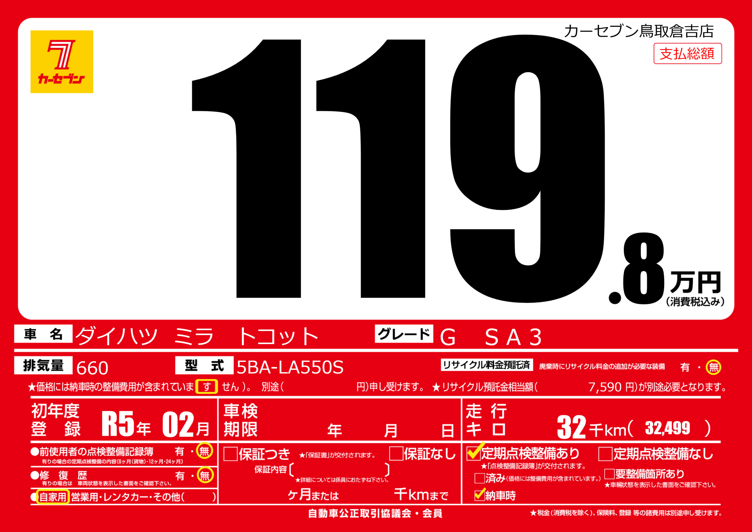 | 走行キロ | 3.2万km | 初年度登録 | R5年02月 |