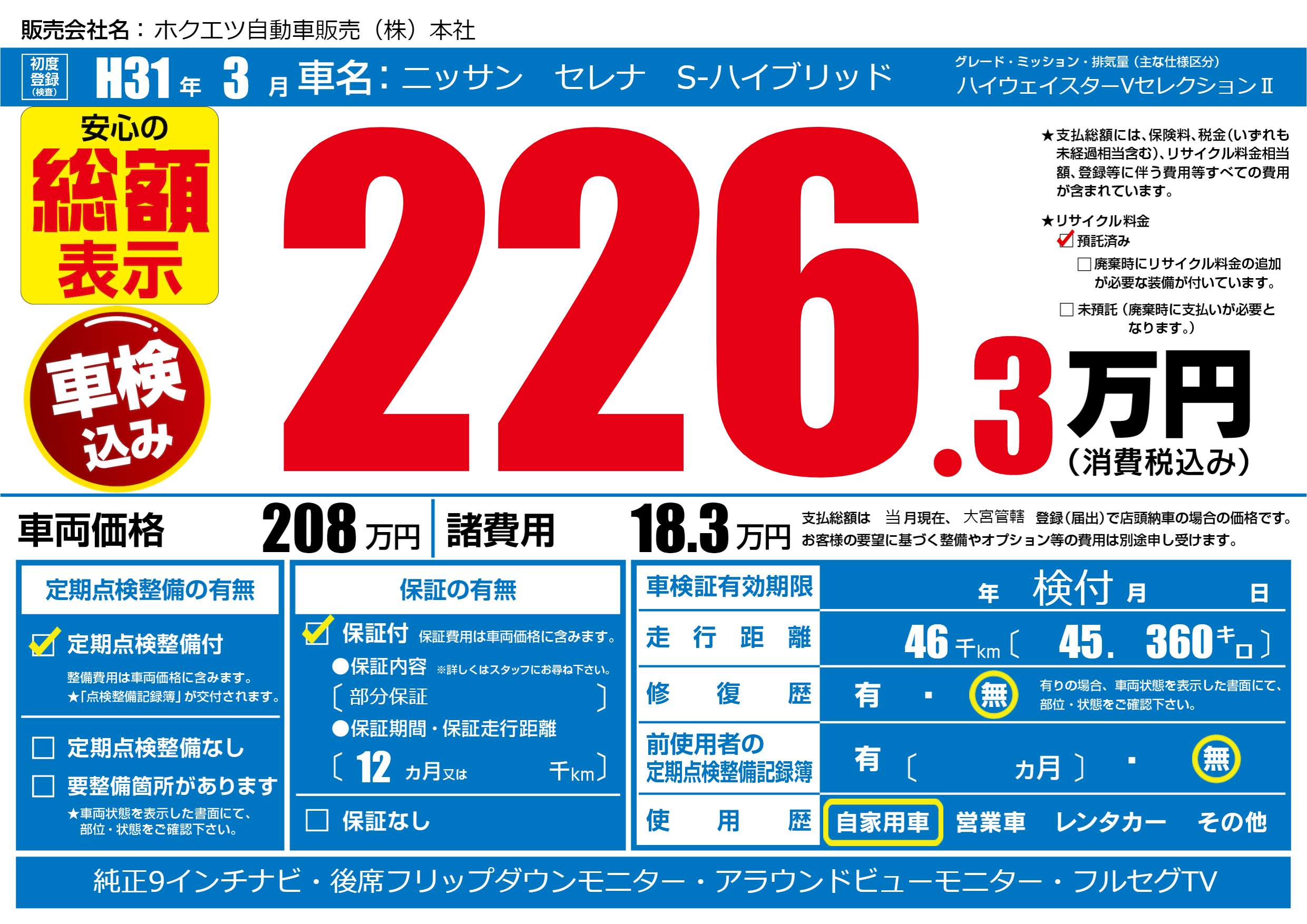 保証付き 保証内容(部分保証) 12ヶ月または()千kmまで |