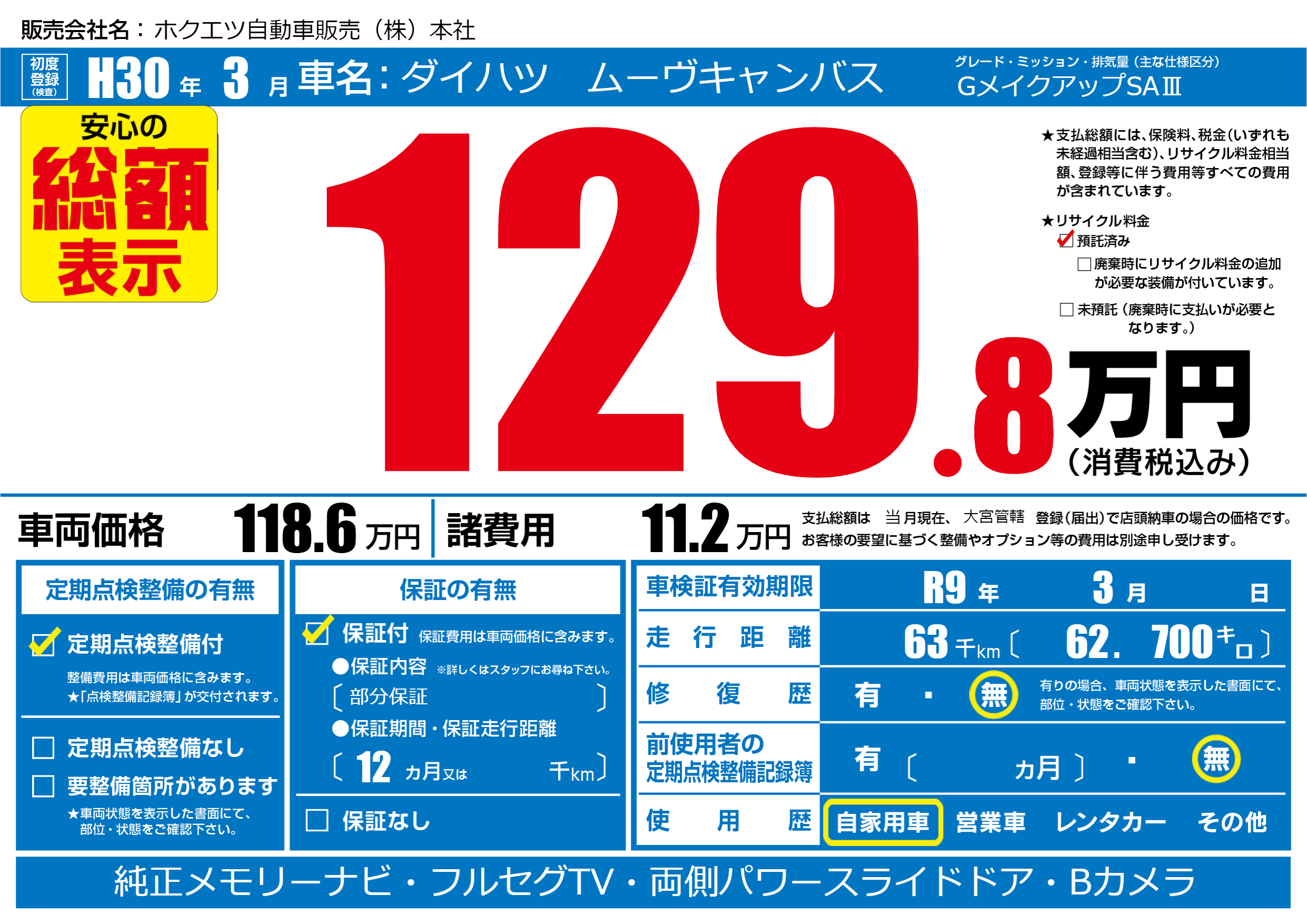 | 車検制限 | R9年 3月 - 日 | ||