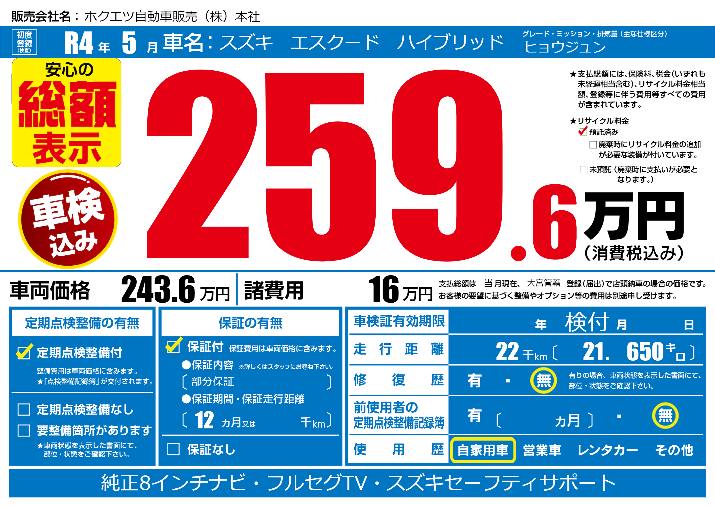 保証付き 保証内容(部分保証) 12ヶ月または()千kmまで |