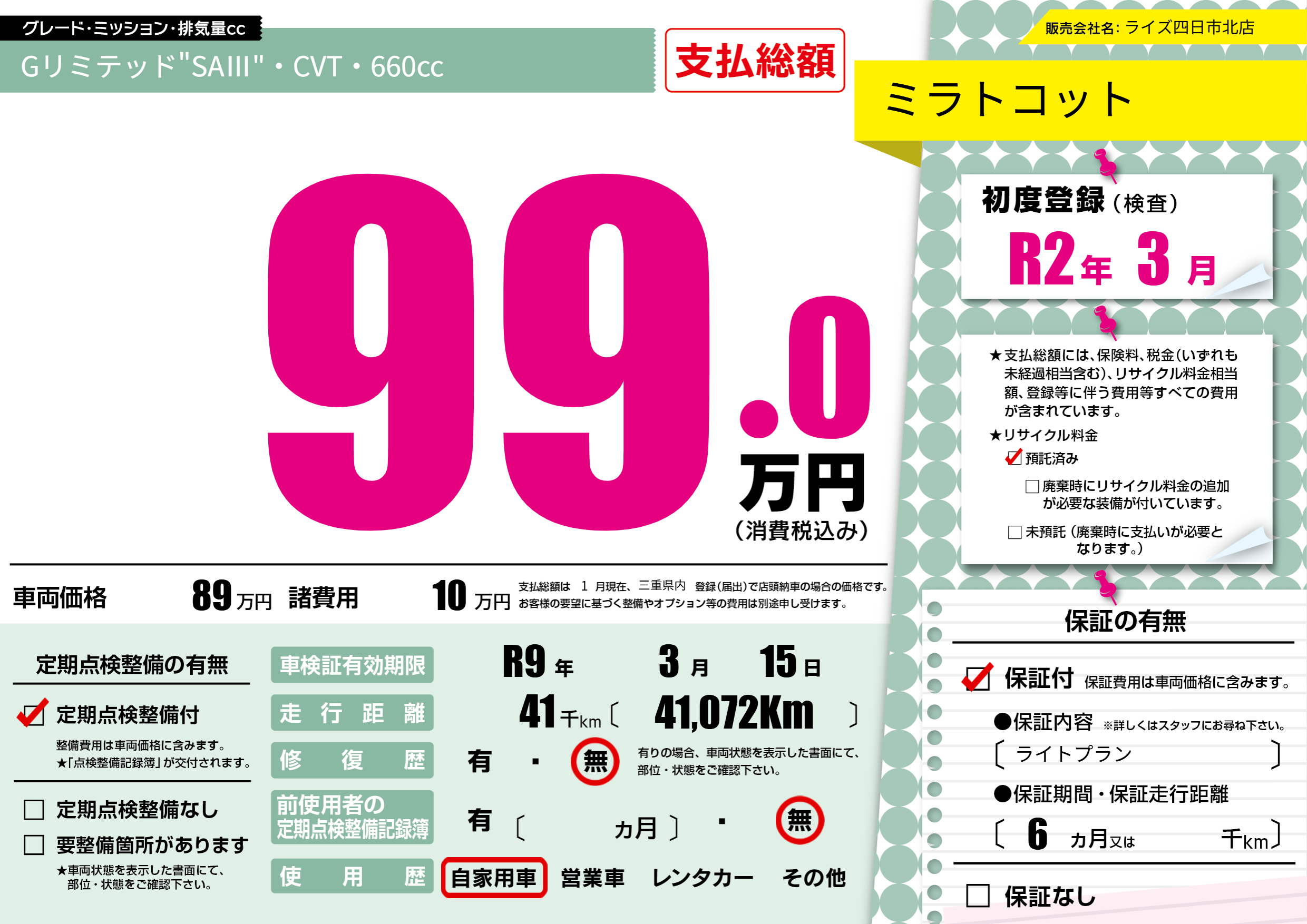 なし | 車検制限 | R9年3月15月 |