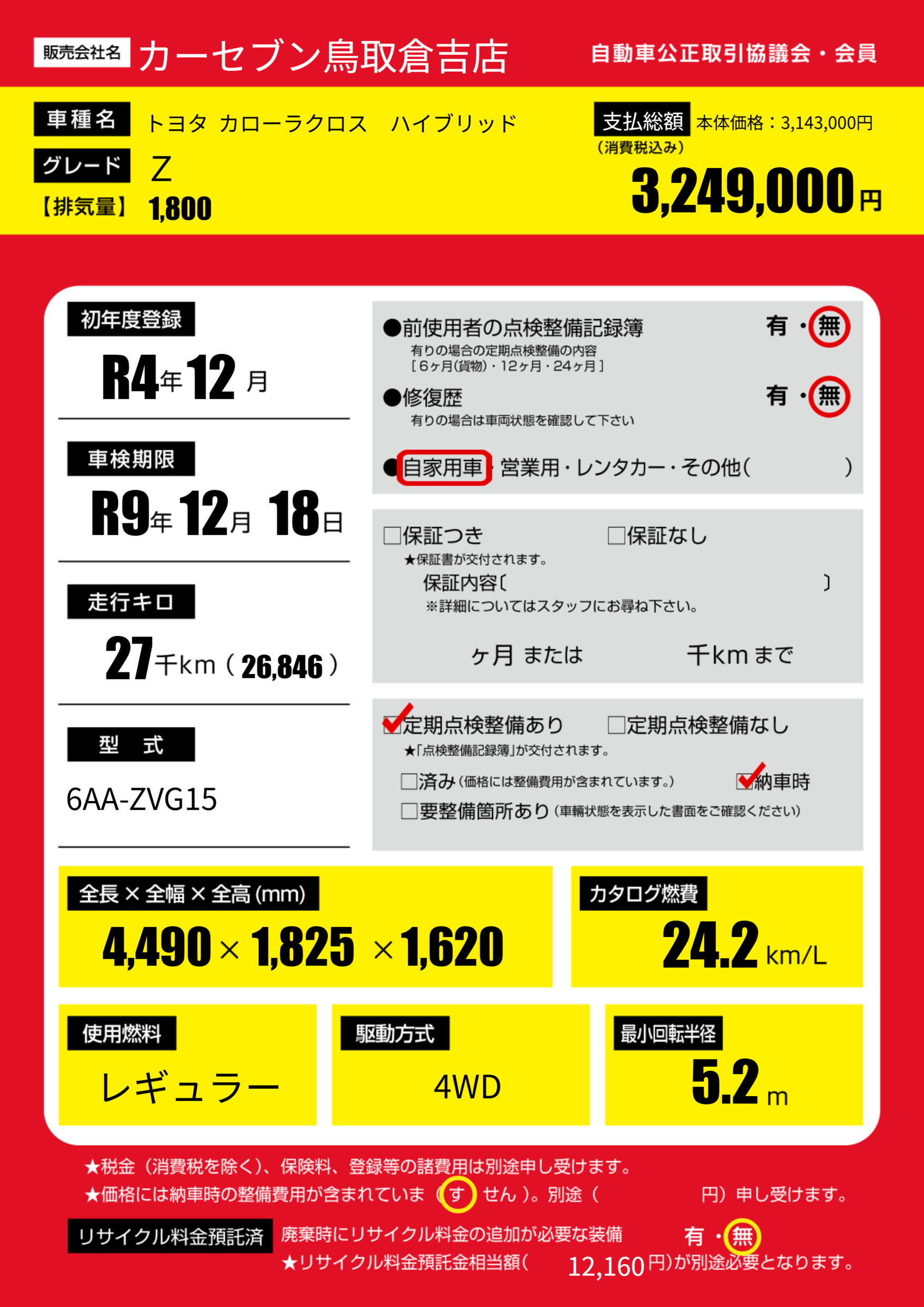 | 走行キロ | 2.7万km | 初年度登録 | R4年12月 |