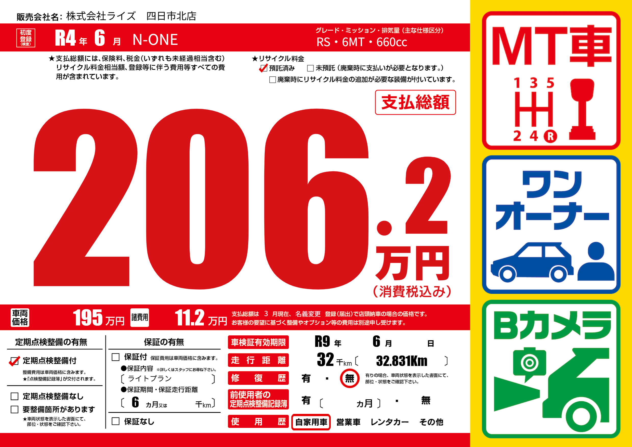 | 車名 | N-ONE | グレード ミッション 排気量 |