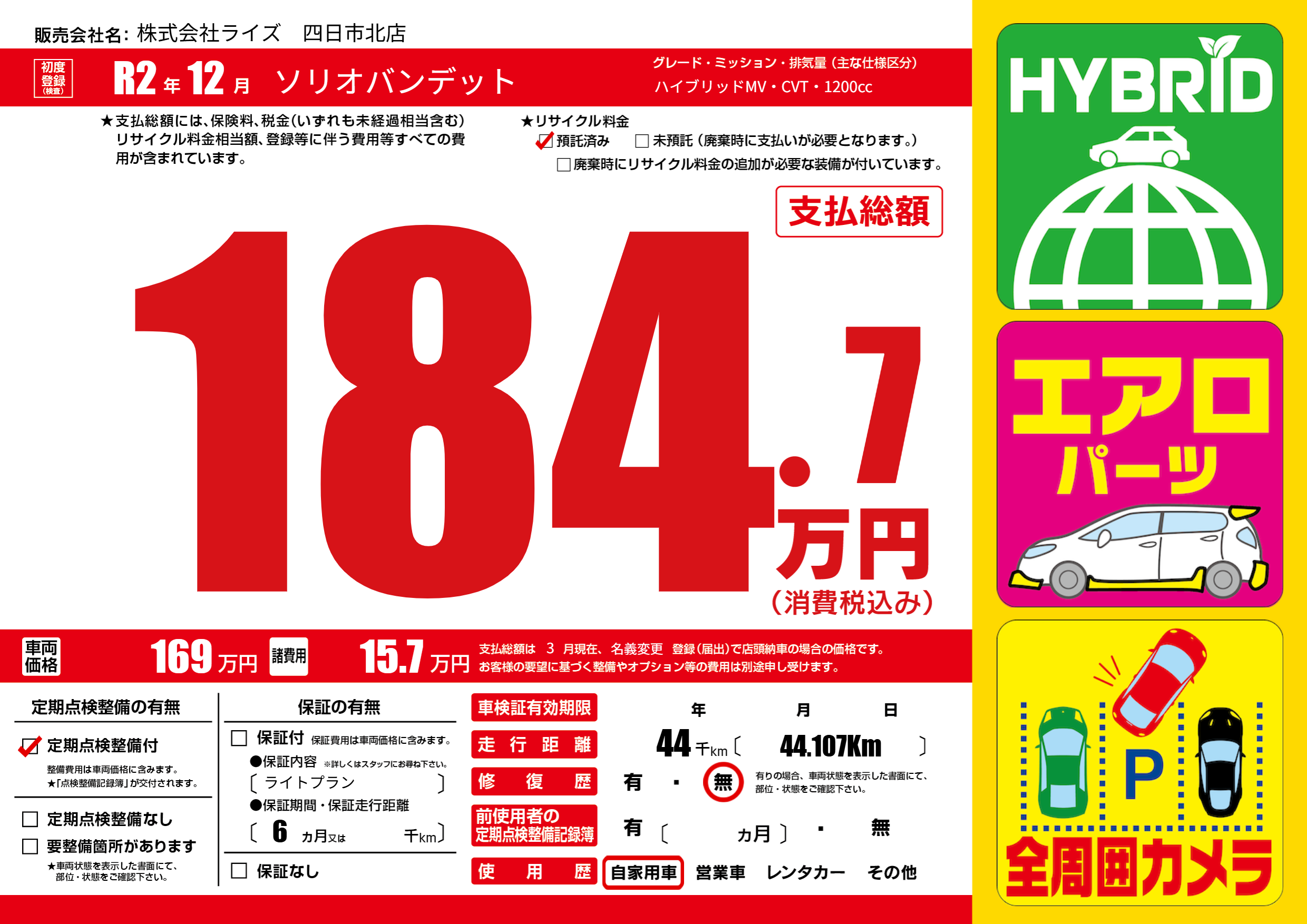 | 車名 | ソリオバンデット | グレード ミッション 排気量 |