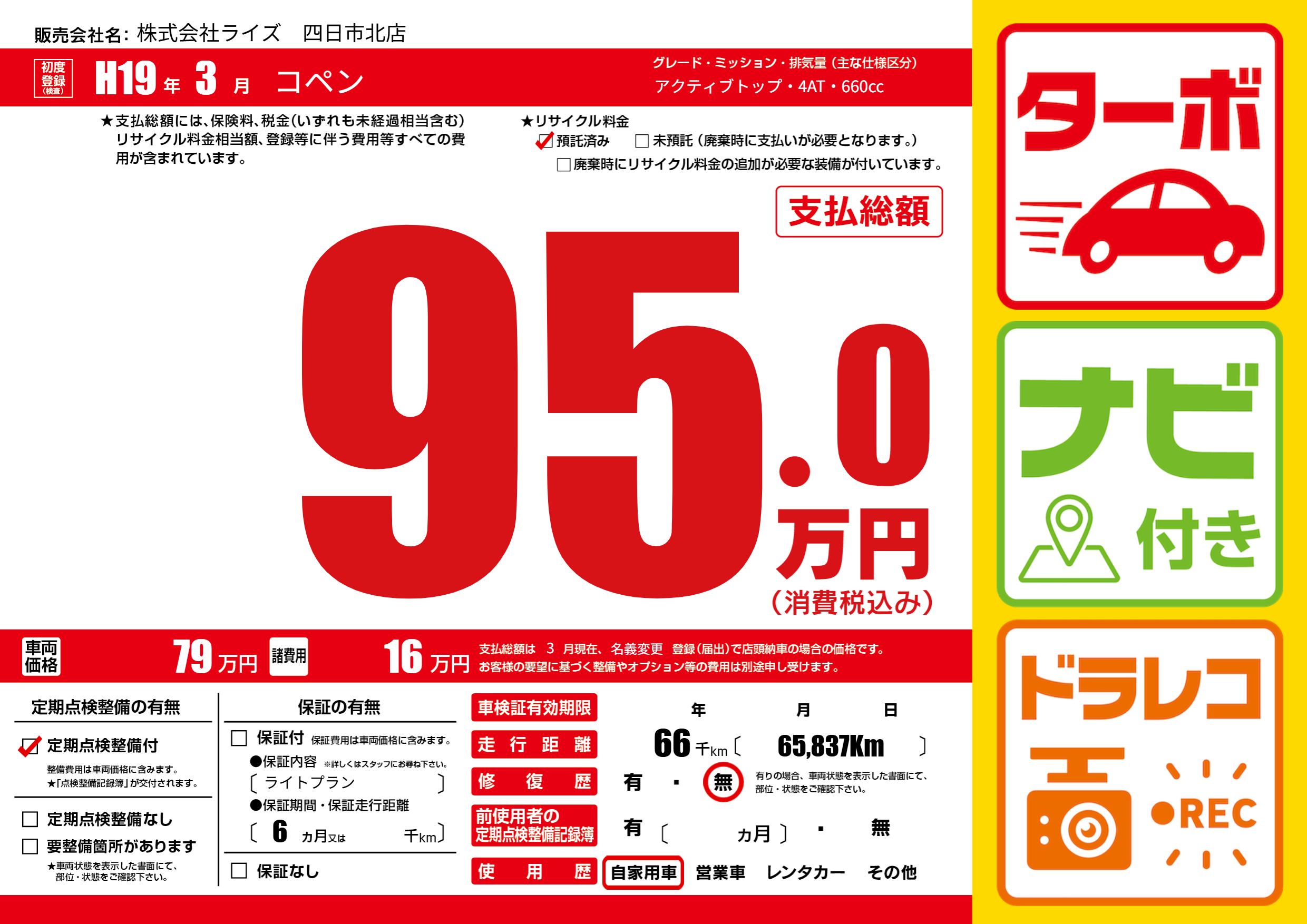 | 走行キロ | 6.6万km | 初年度登録 | H19年3月 |