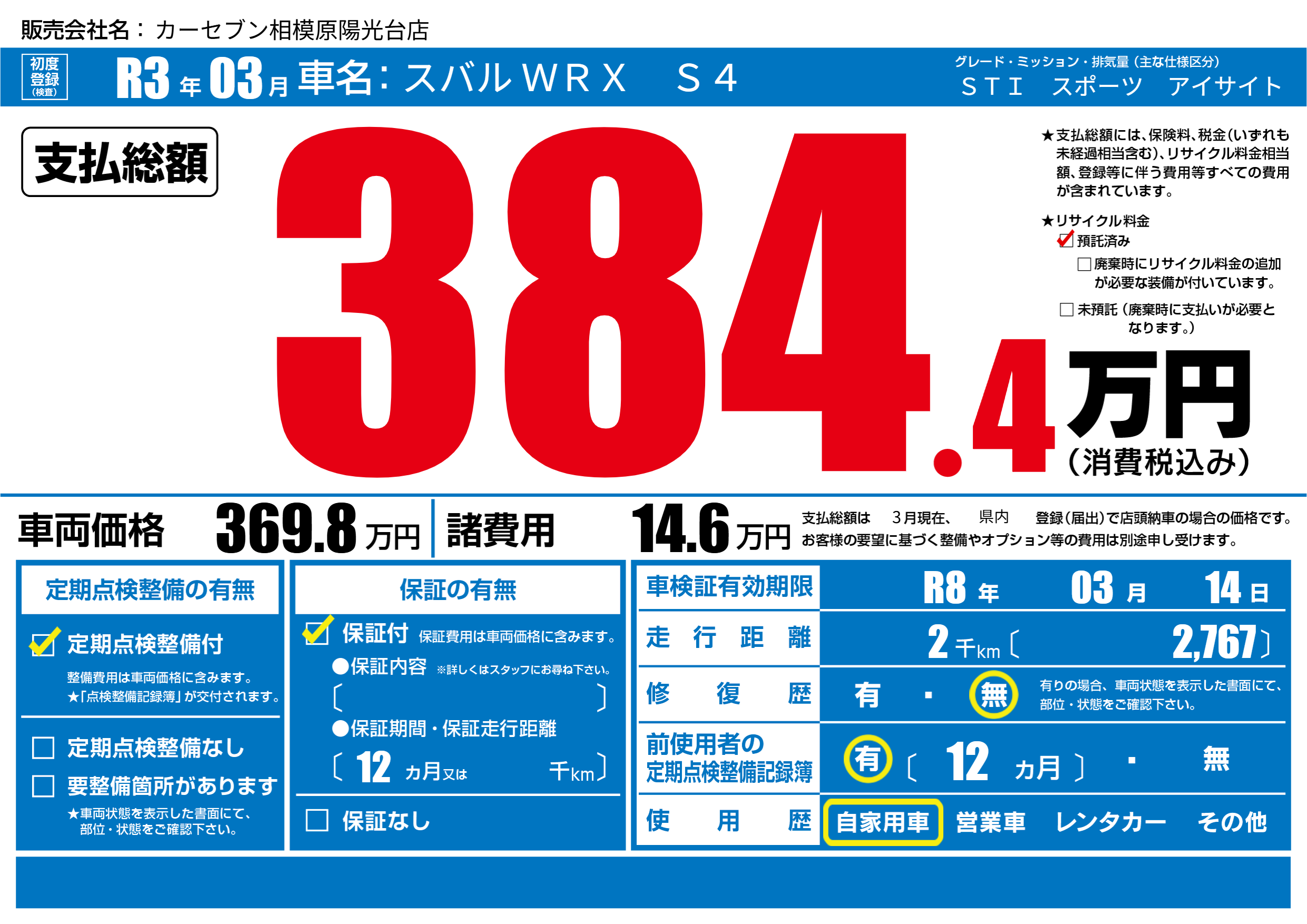 | 車名 | スバル WRX S4 | グレード ミッション 排気量 |