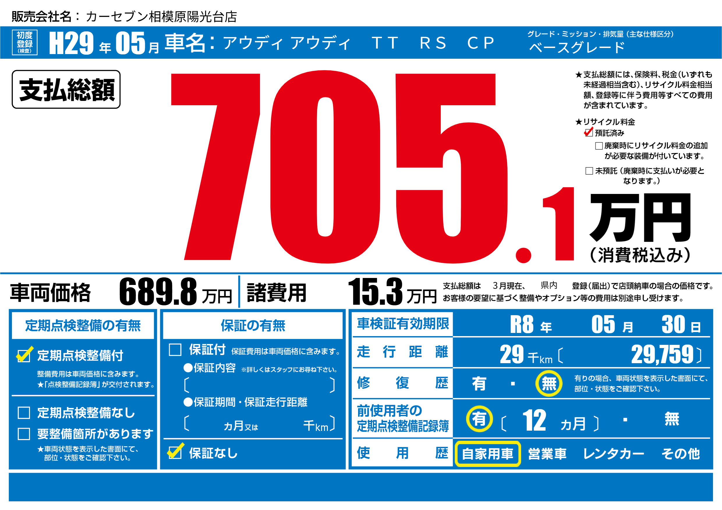 | 車名 | アウディ アウディ TT RS CP | グレード ミッション 排気量 |