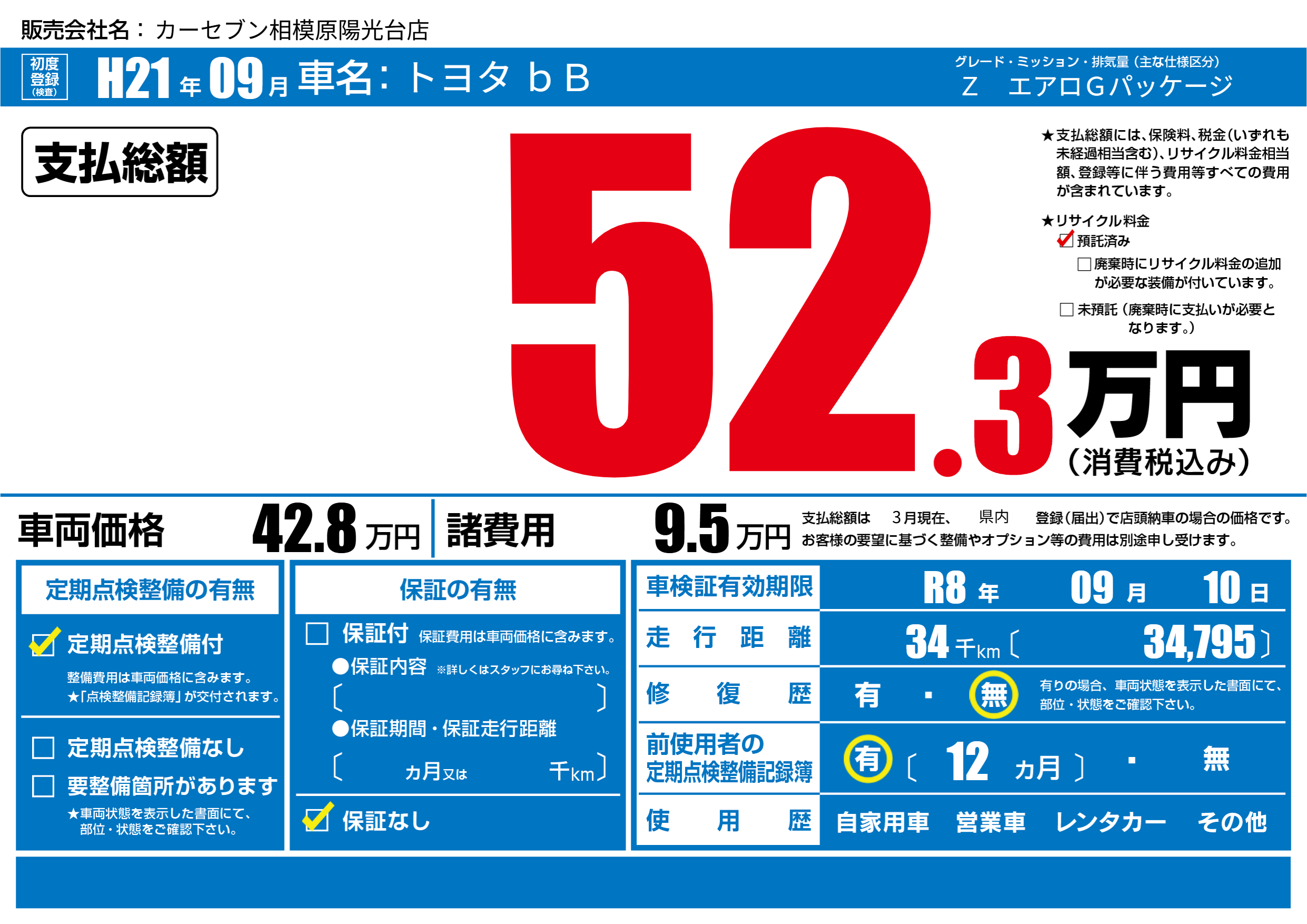| 車名 | トヨタ bB | グレード ミッション 排気量 |
