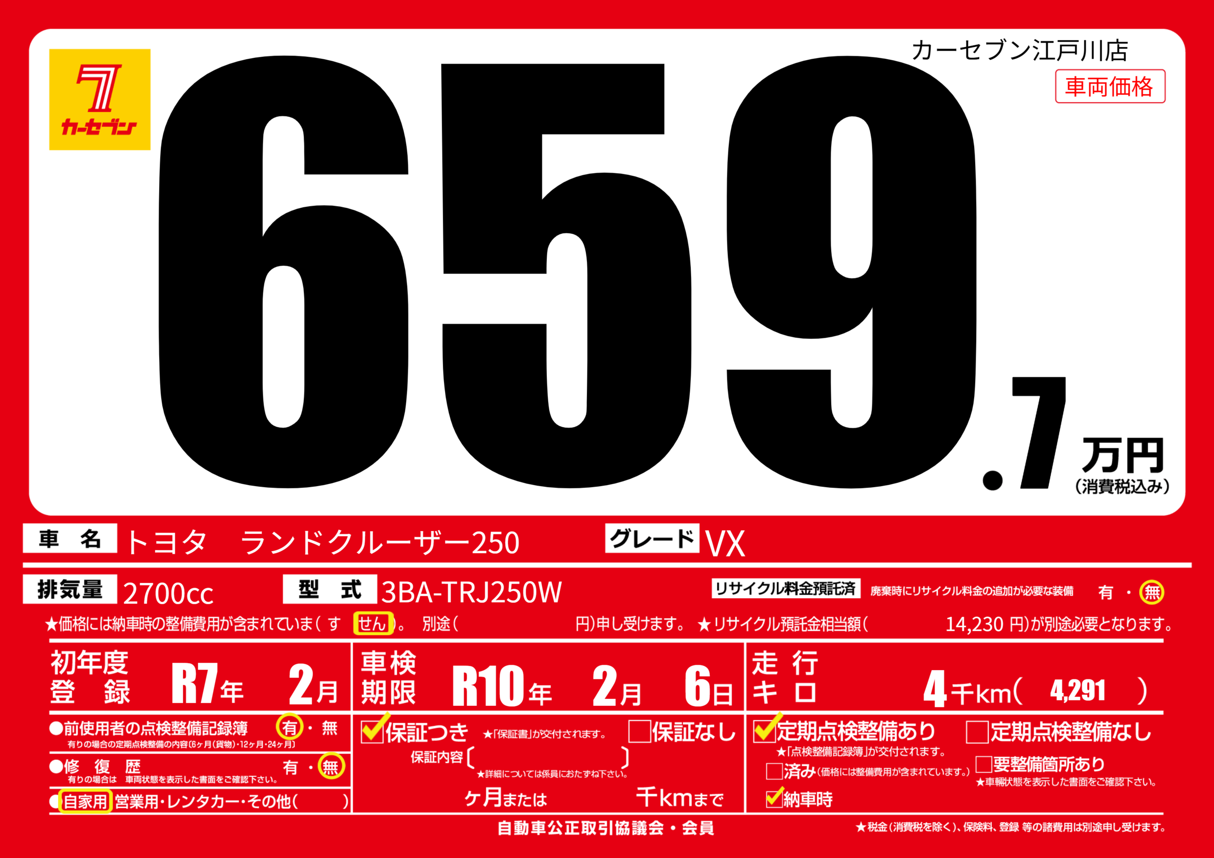 | 車名 | トヨタ ランドクルーザー250 | グレード ミッション 排気量 |