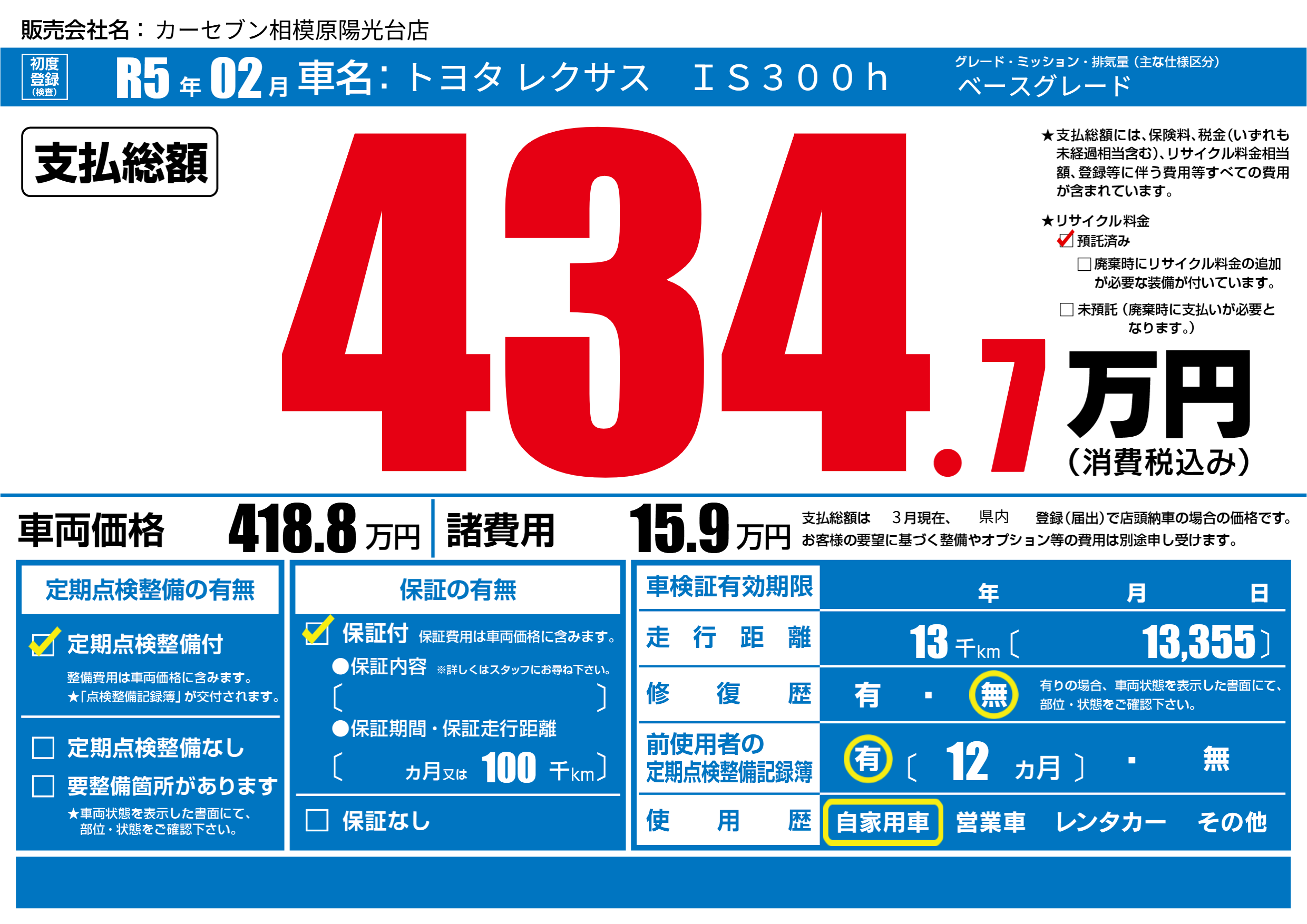 | 定期点検整備 | 定期点検整備あり | ||