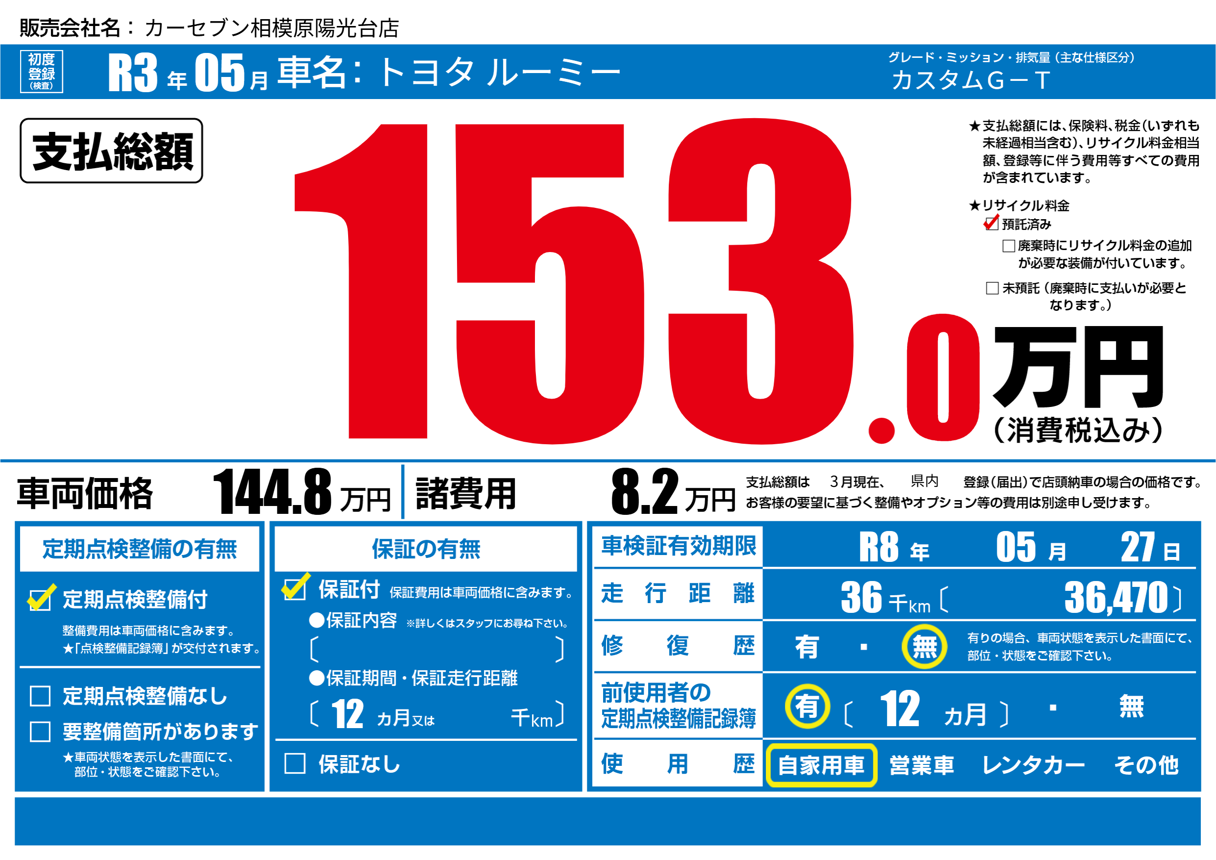 | 車検制限 | R8年 05月 27日 | ||