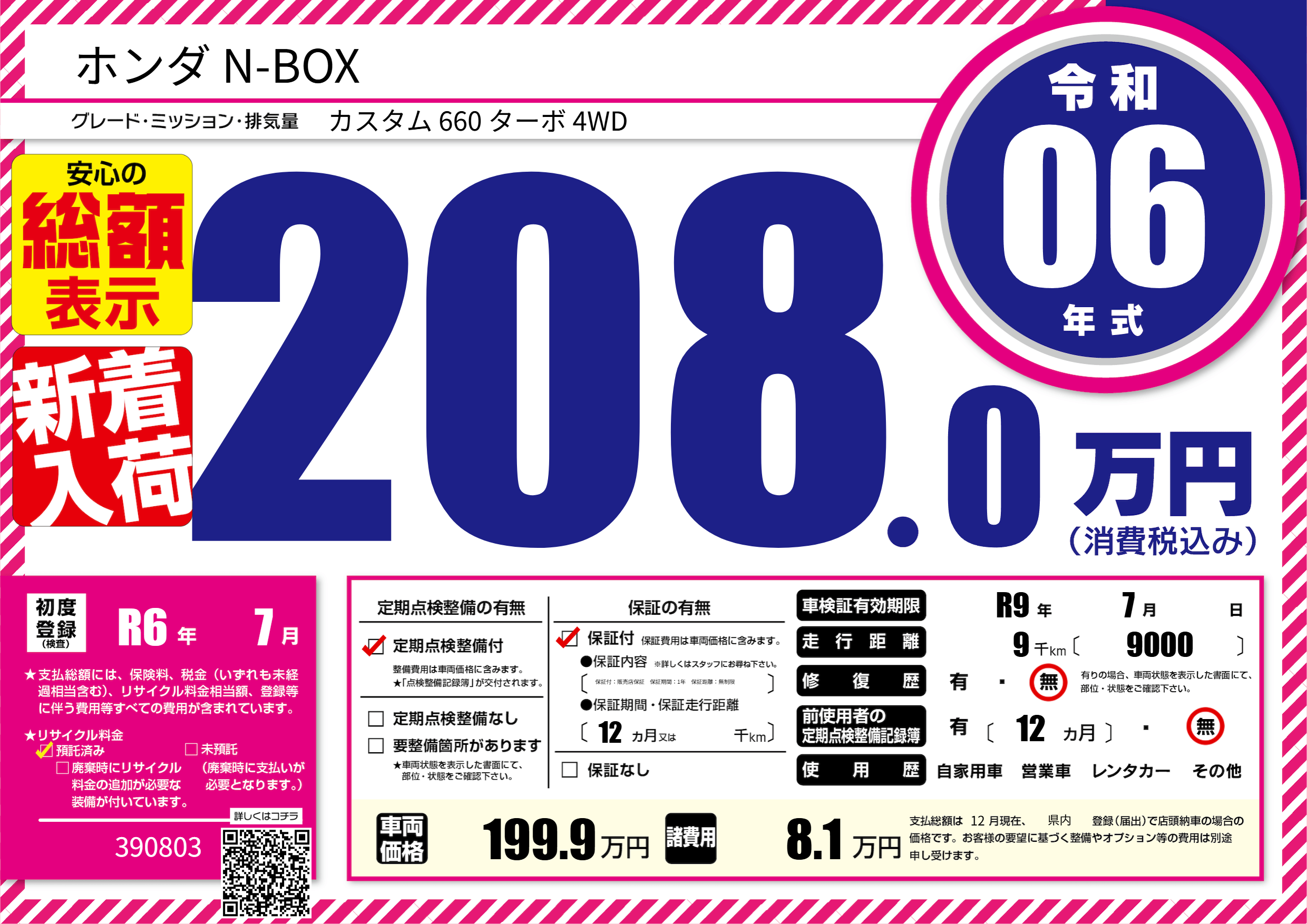 | 走行キロ | 0.9万km | 初年度登録 | R6年7月 |