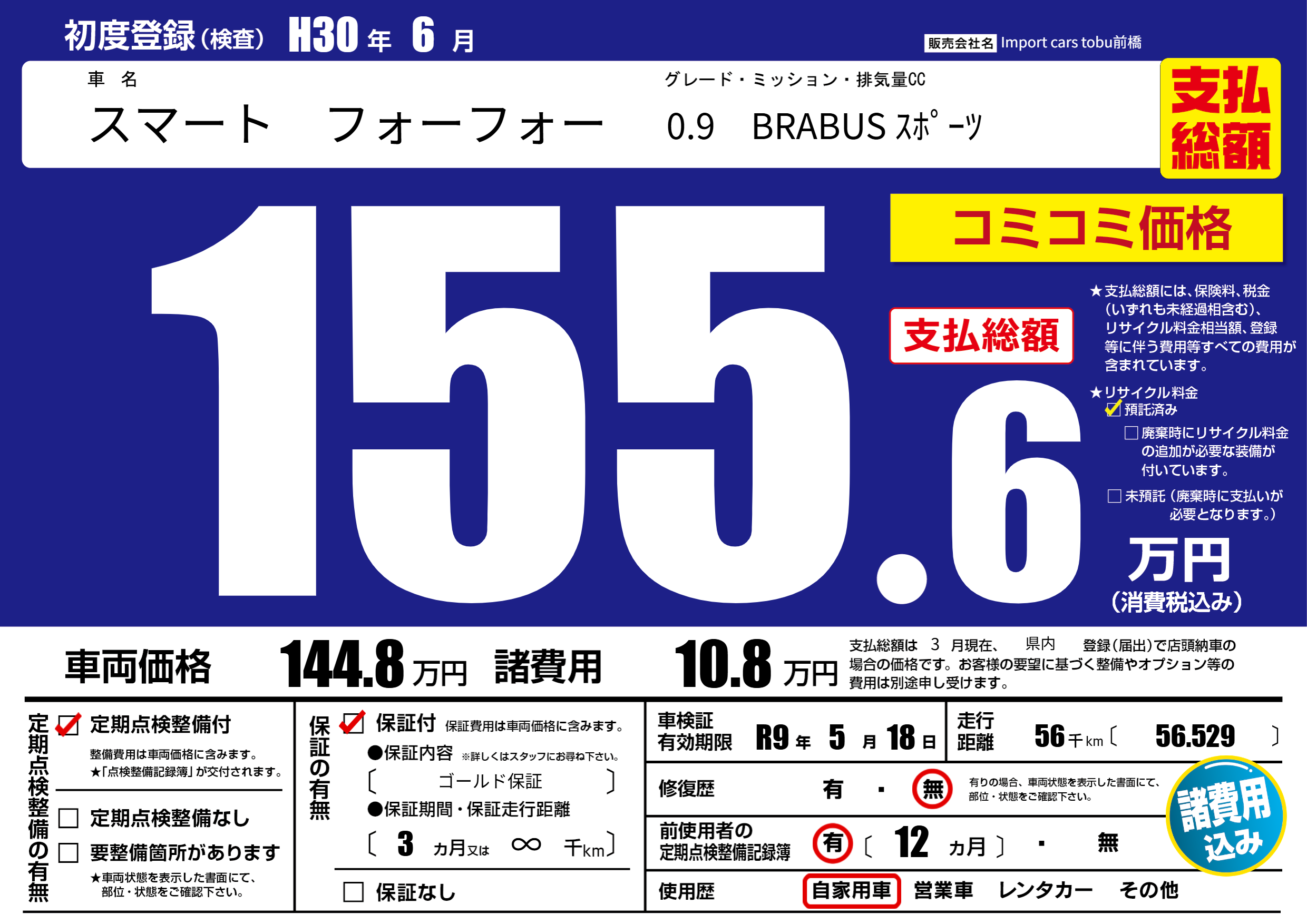 | 車名 | スマート フォーフォー | グレード ミッション 排気量 |