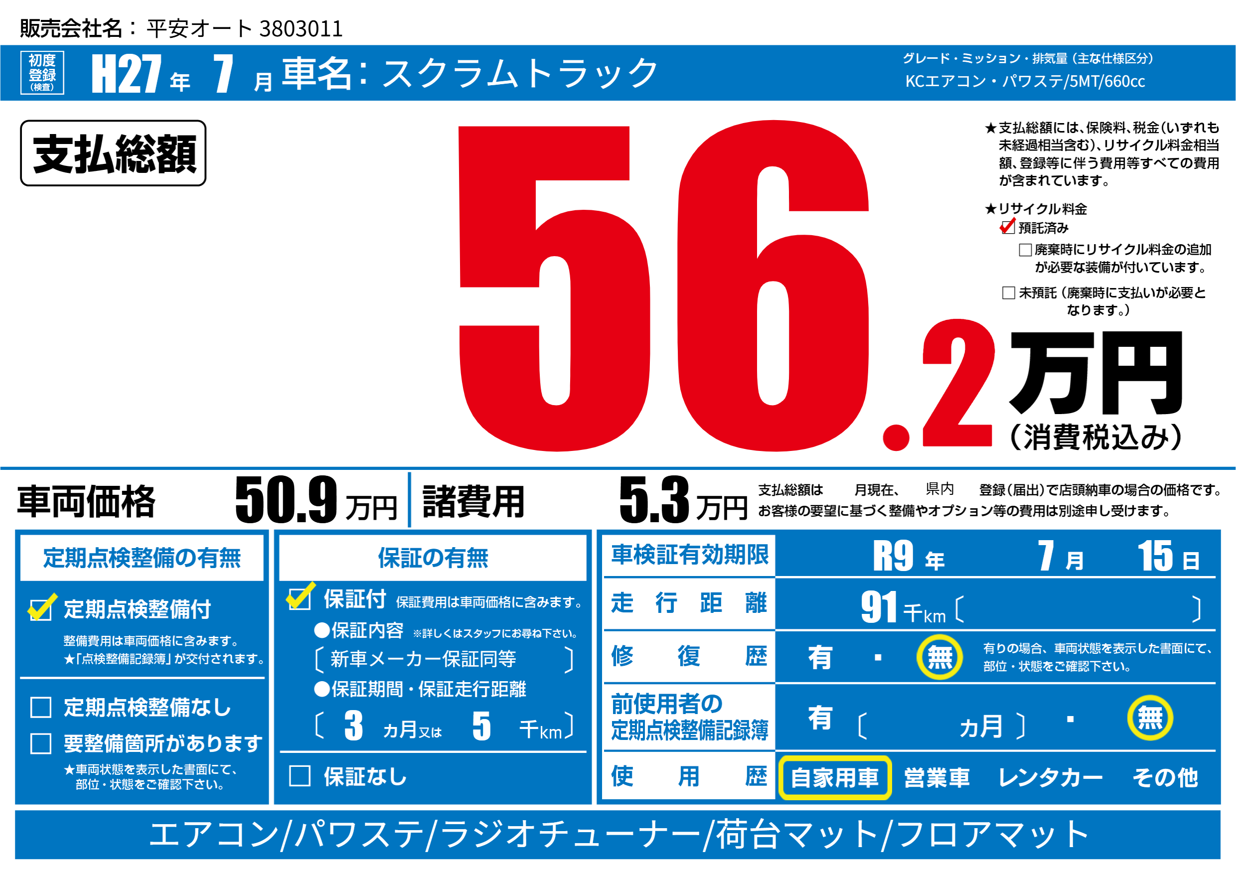 | 走行キロ | 9.1万km | 初年度登録 | H27年7月 |