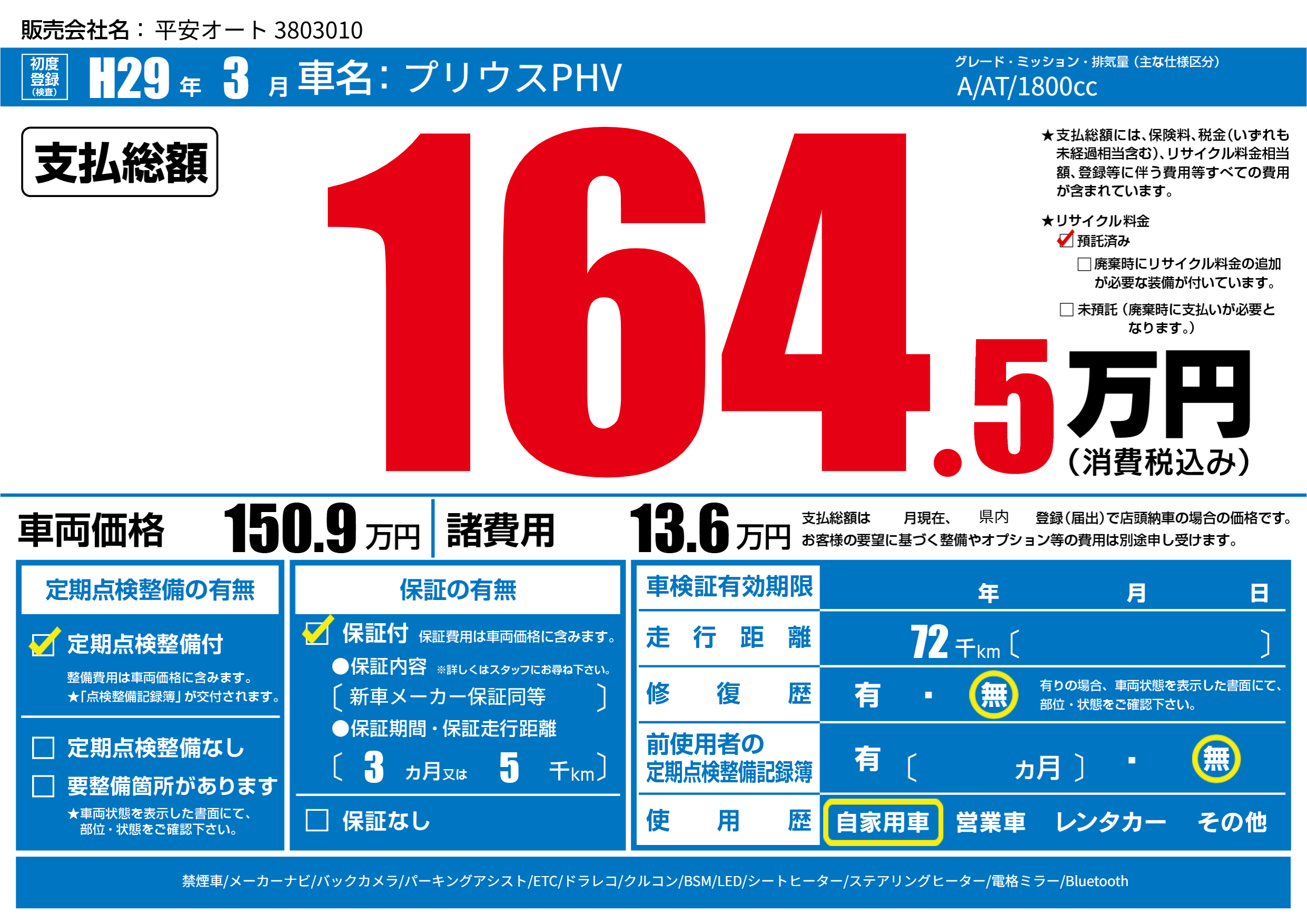 保証付き 保証内容(新車メーカー保証同等) 3ヶ月または(5)千kmまで |