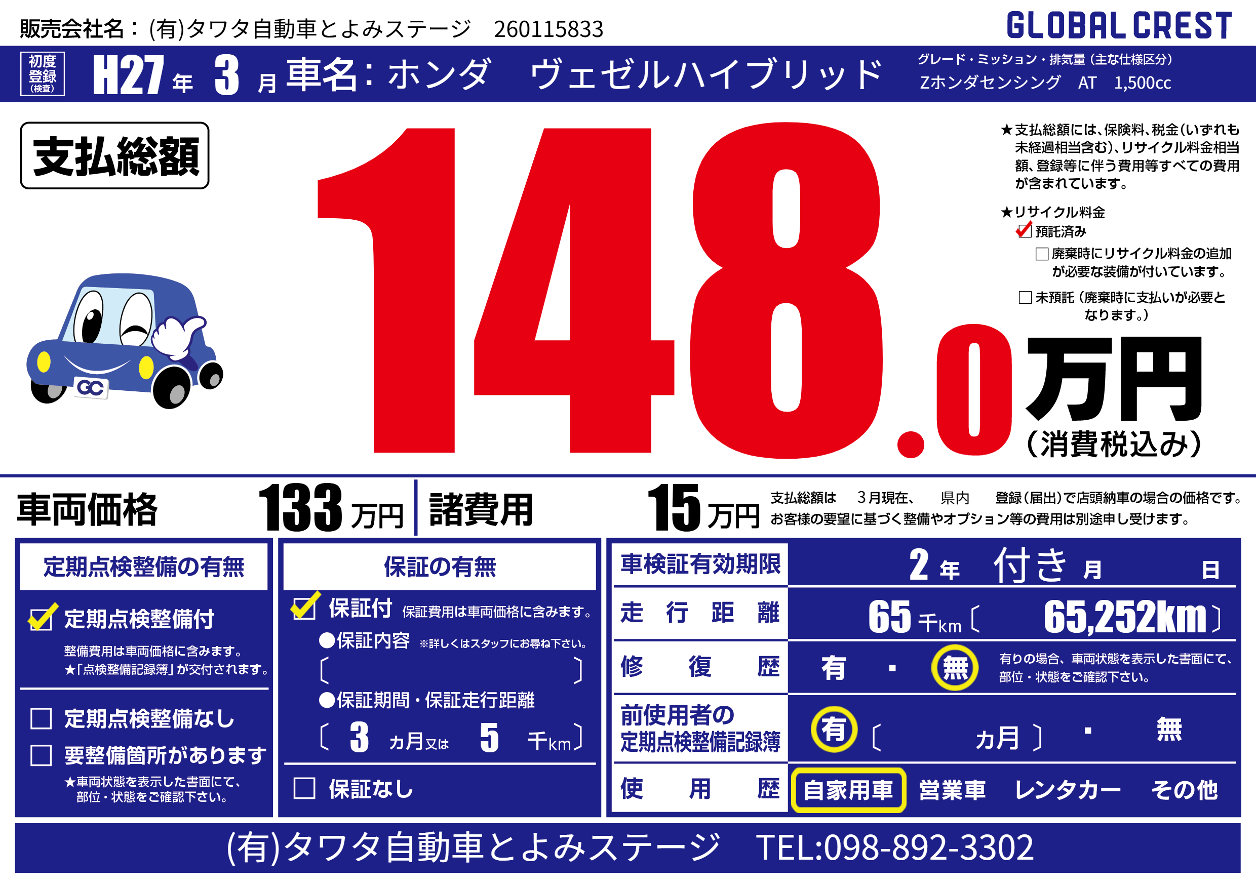 | 走行キロ | 6.5万km | 初年度登録 | H27年3月 |