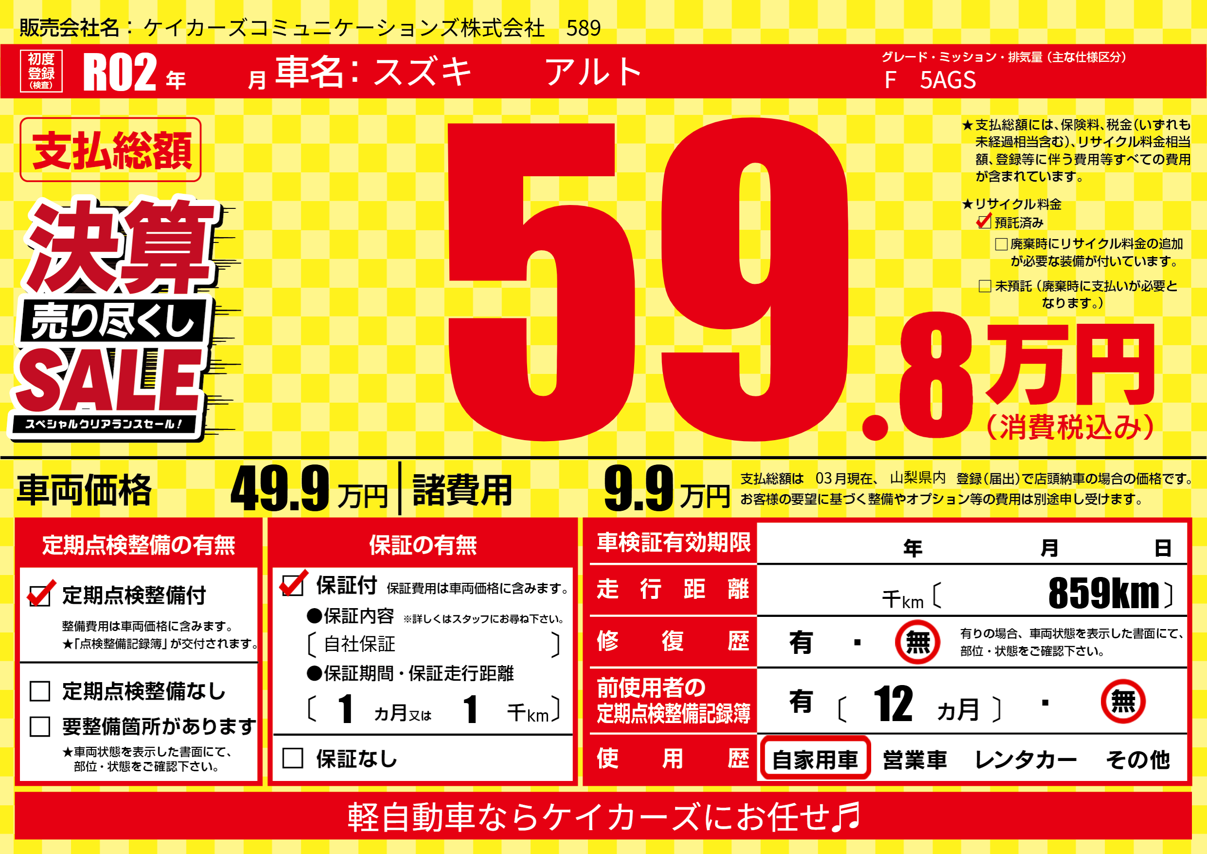 | 車名 | スズキ アルト | グレード ミッション 排気量 |
