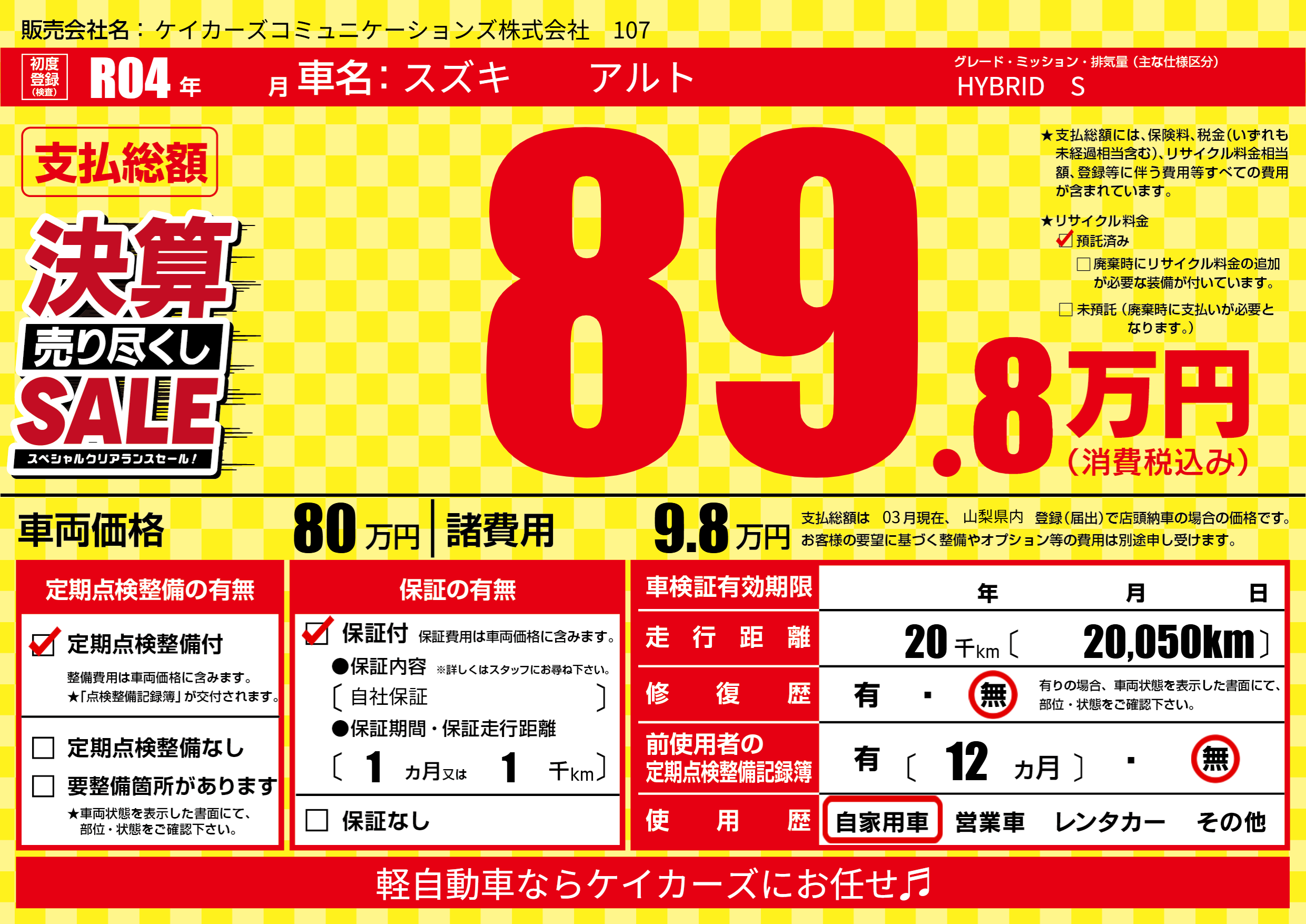| 車名 | スズキ アルト | グレード ミッション 排気量 |