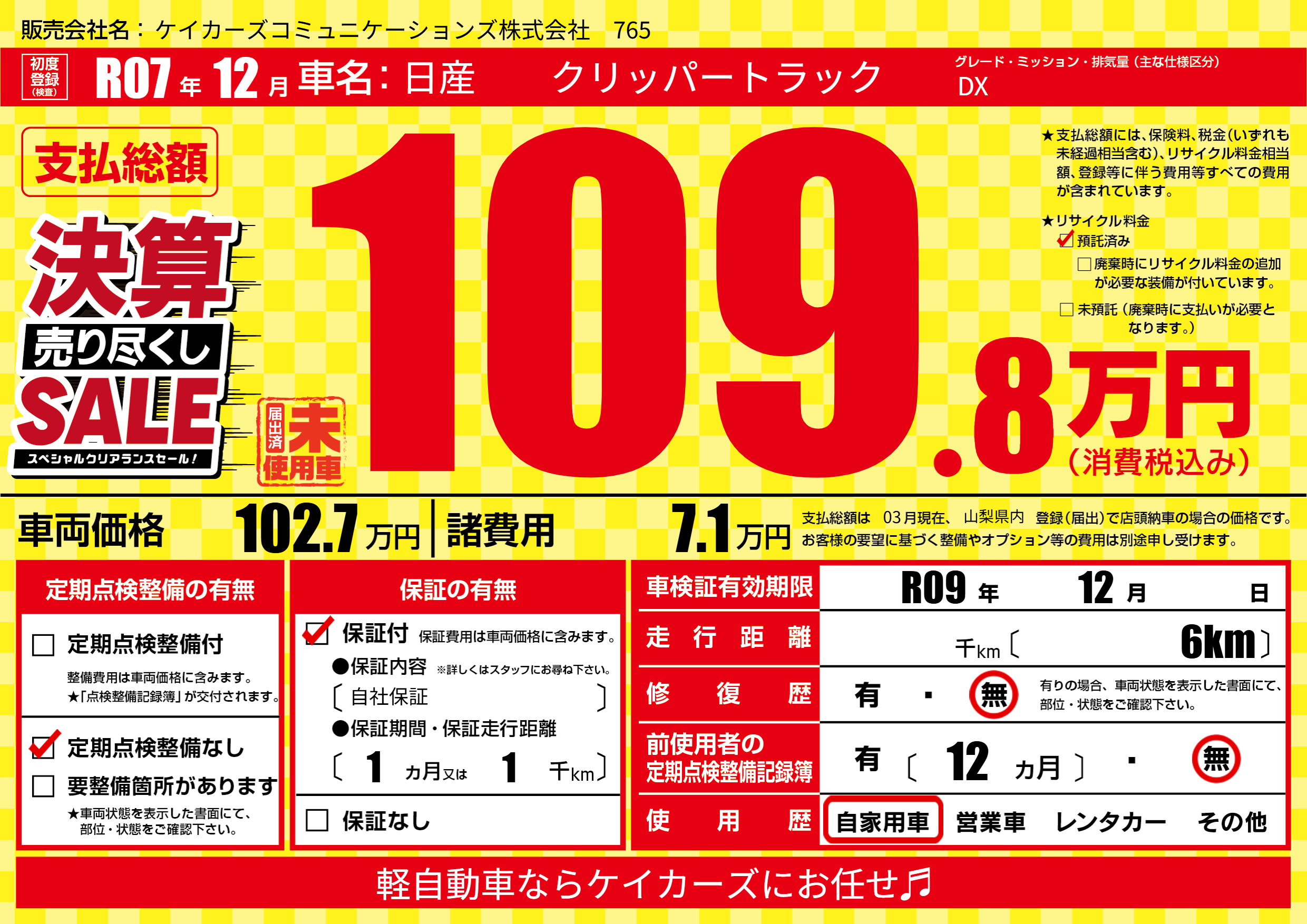 | 車検制限 | R09年 12月 - 日 | ||