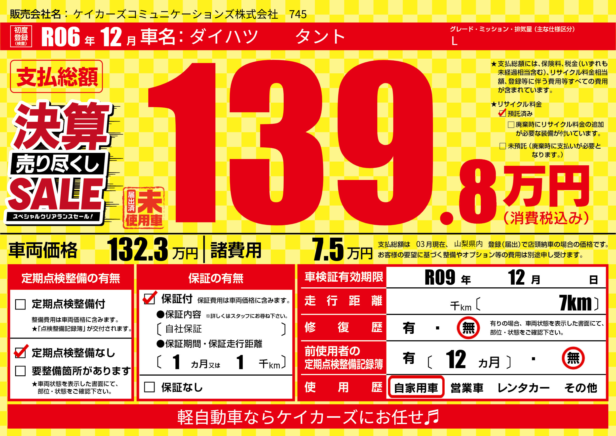 | 車検制限 | R09年 12月 - 日 | ||