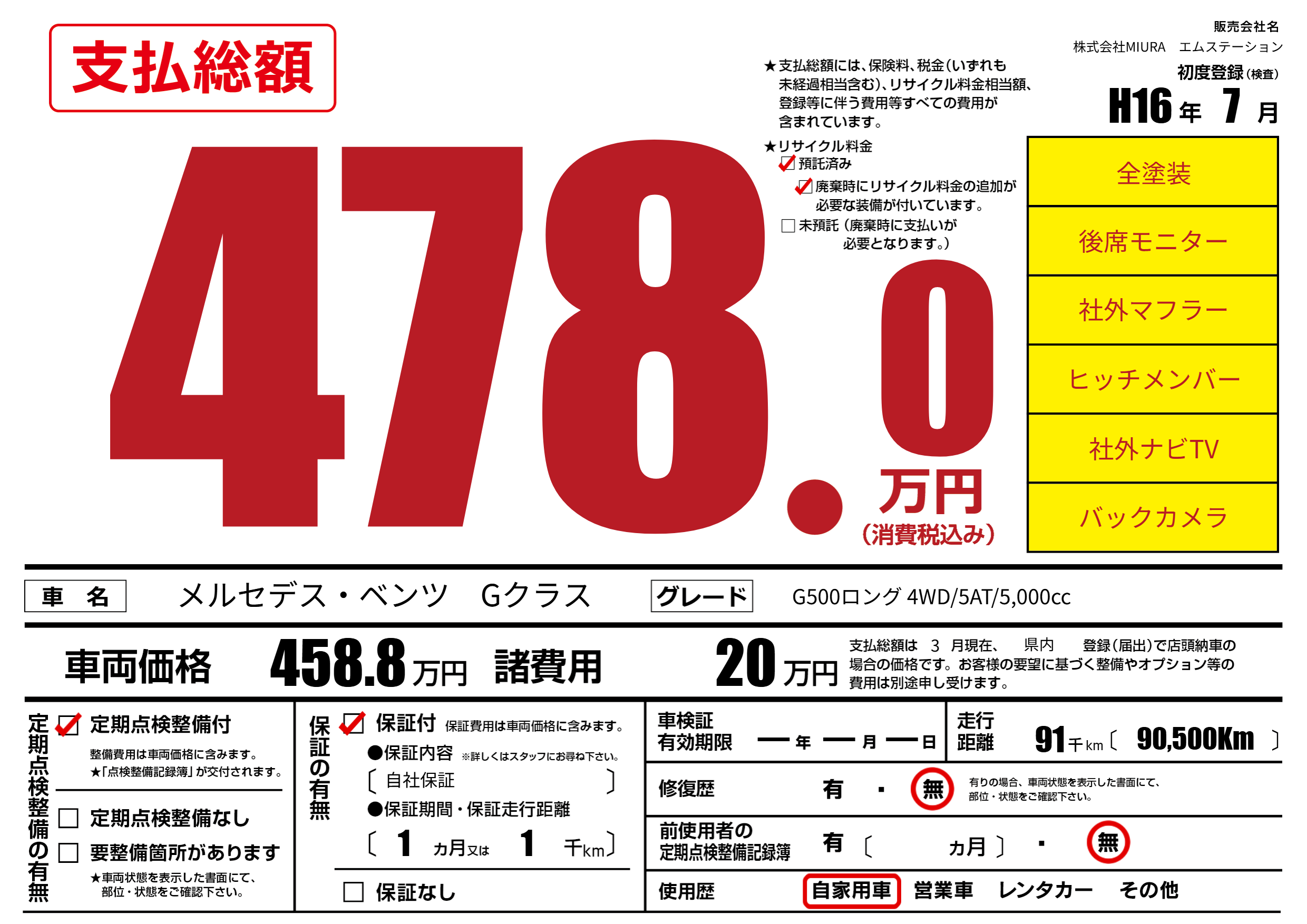 | 走行キロ | 9.1万km | 初年度登録 | H16年7月 |