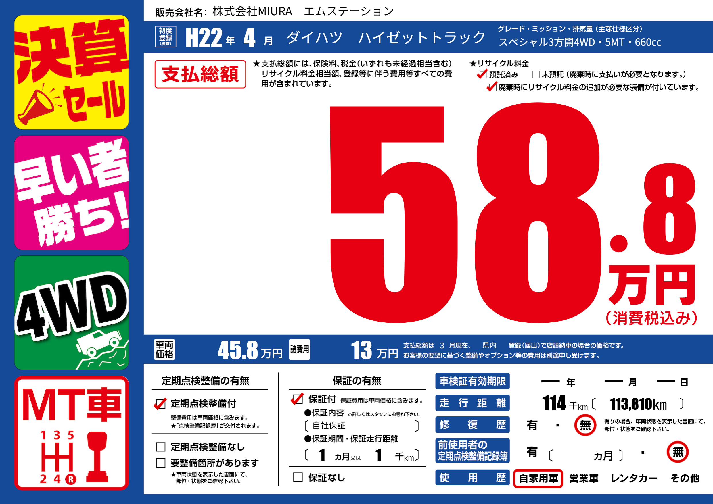 | 走行キロ | 11.4万km | 初年度登録 | H22年4月 |