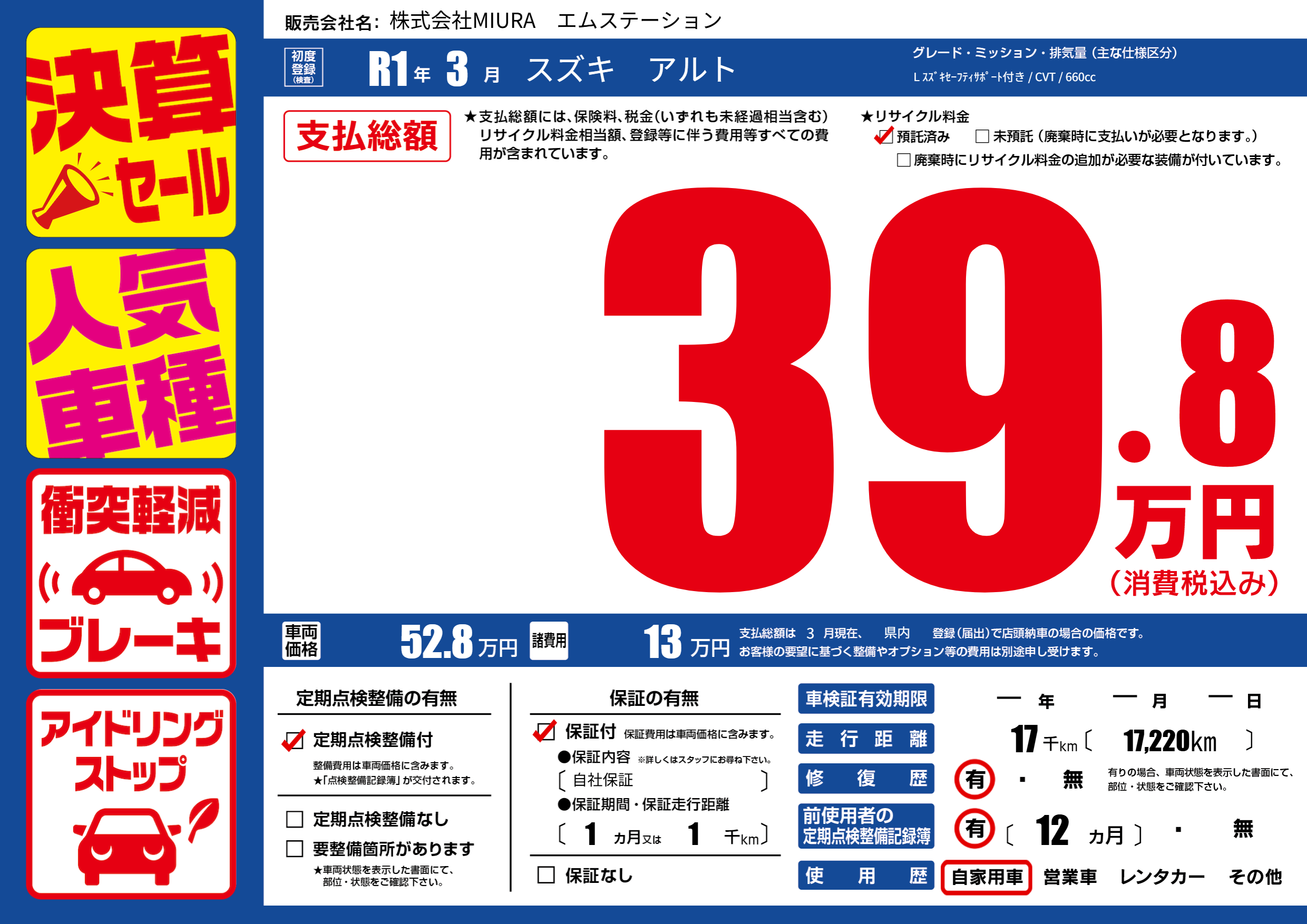 | 車名 | スズキ アルト | グレード ミッション 排気量 |
