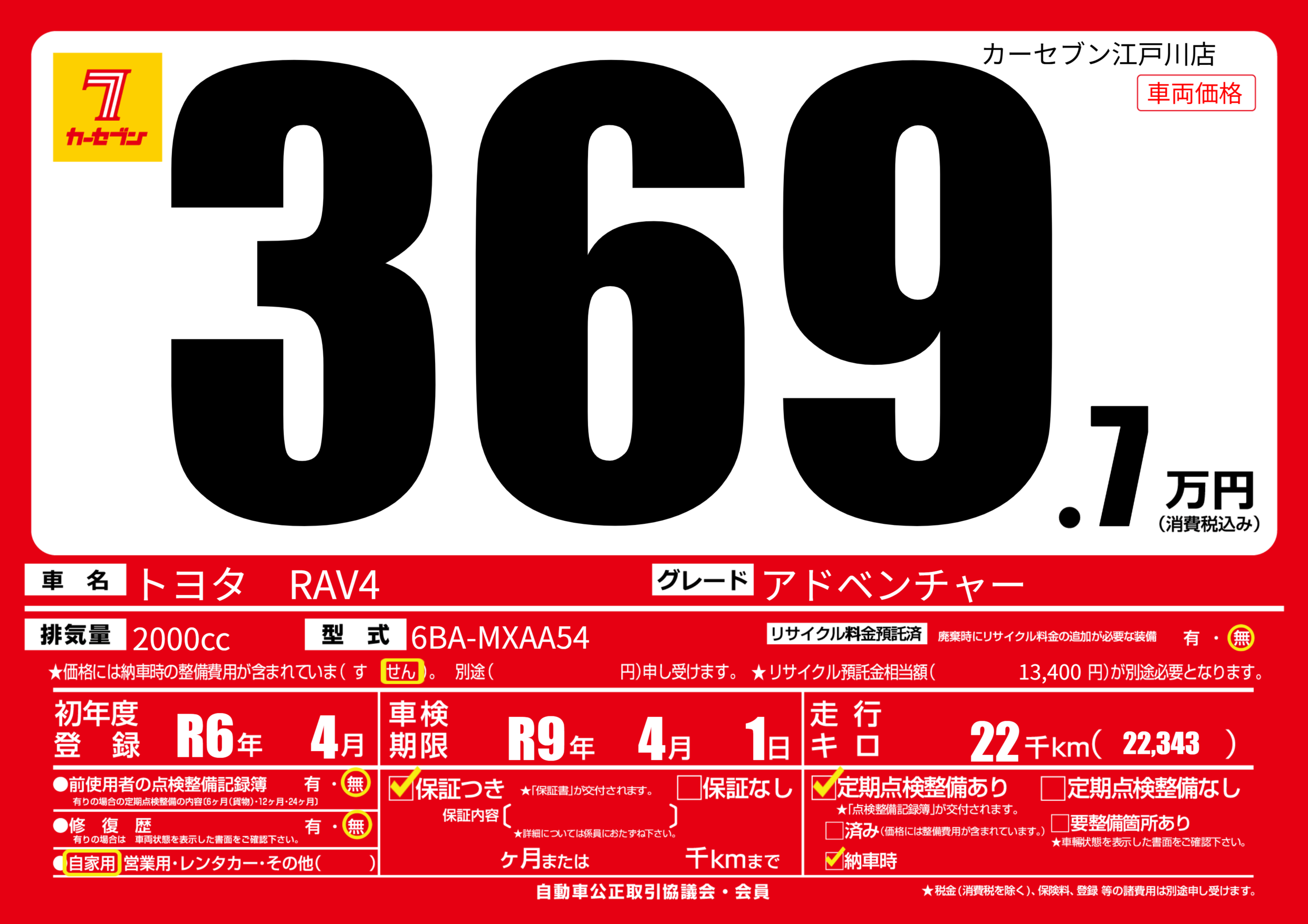 | 車名 | トヨタ RAV4 | グレード ミッション 排気量 |