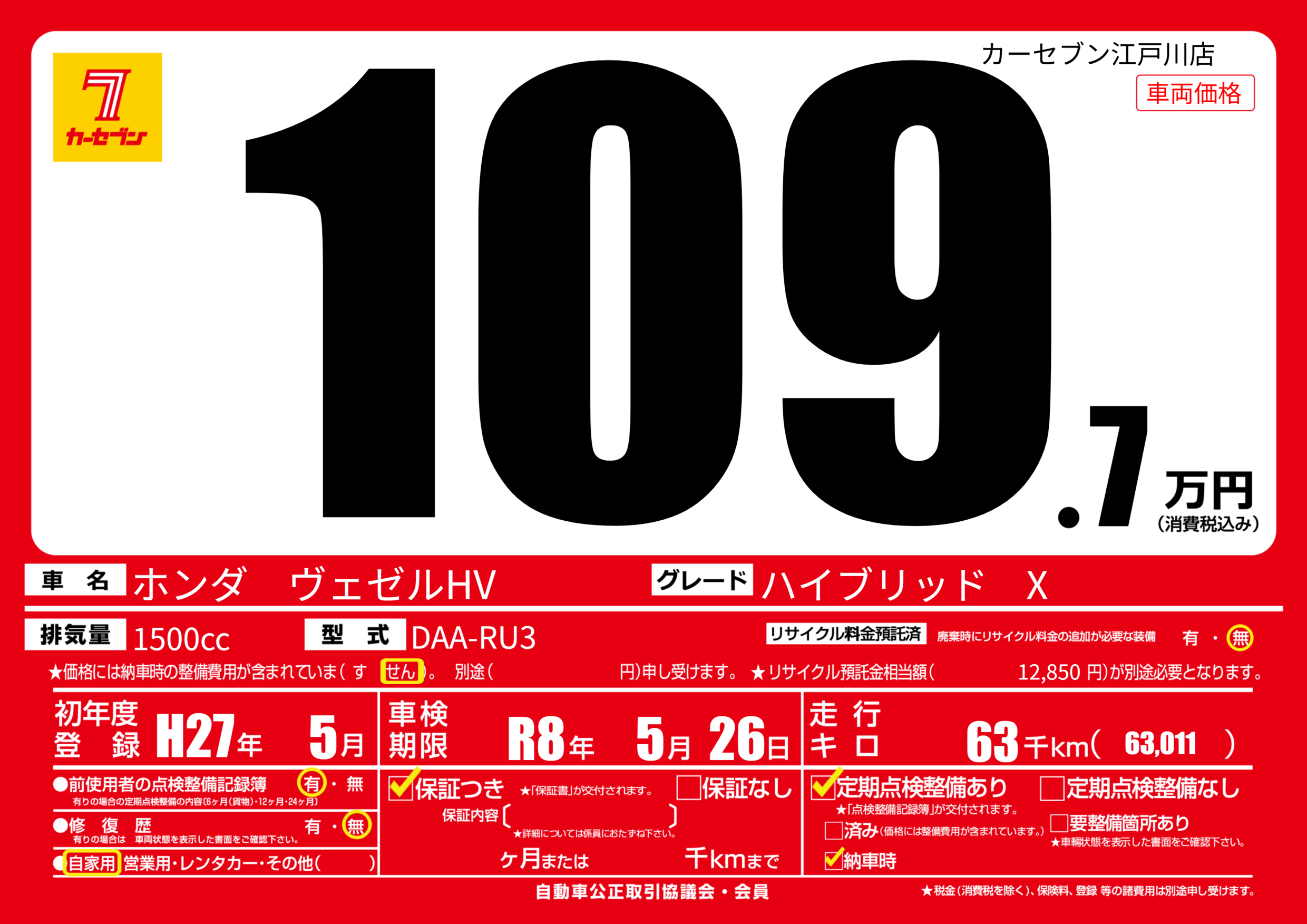 | 車名 | ホンダ ヴェゼルHV | グレード ミッション 排気量 |
