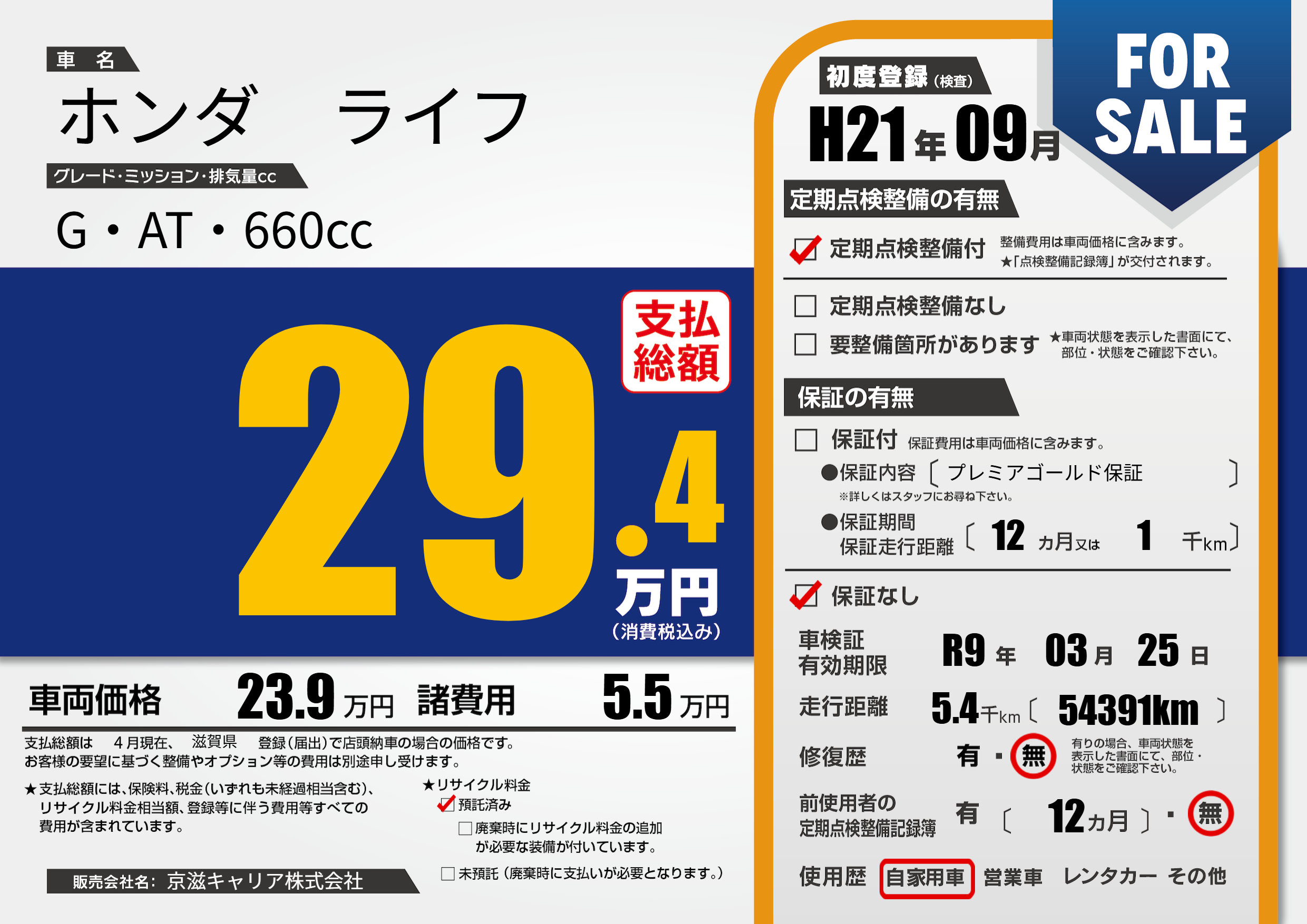 | 車検制限 | R9年 03月 25日 | ||