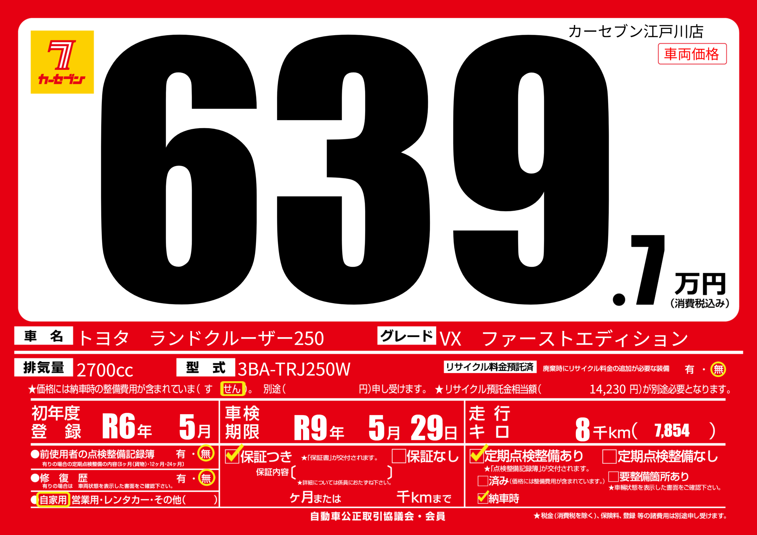 | 走行キロ | 0.8万km | 初年度登録 | R6年5月 |