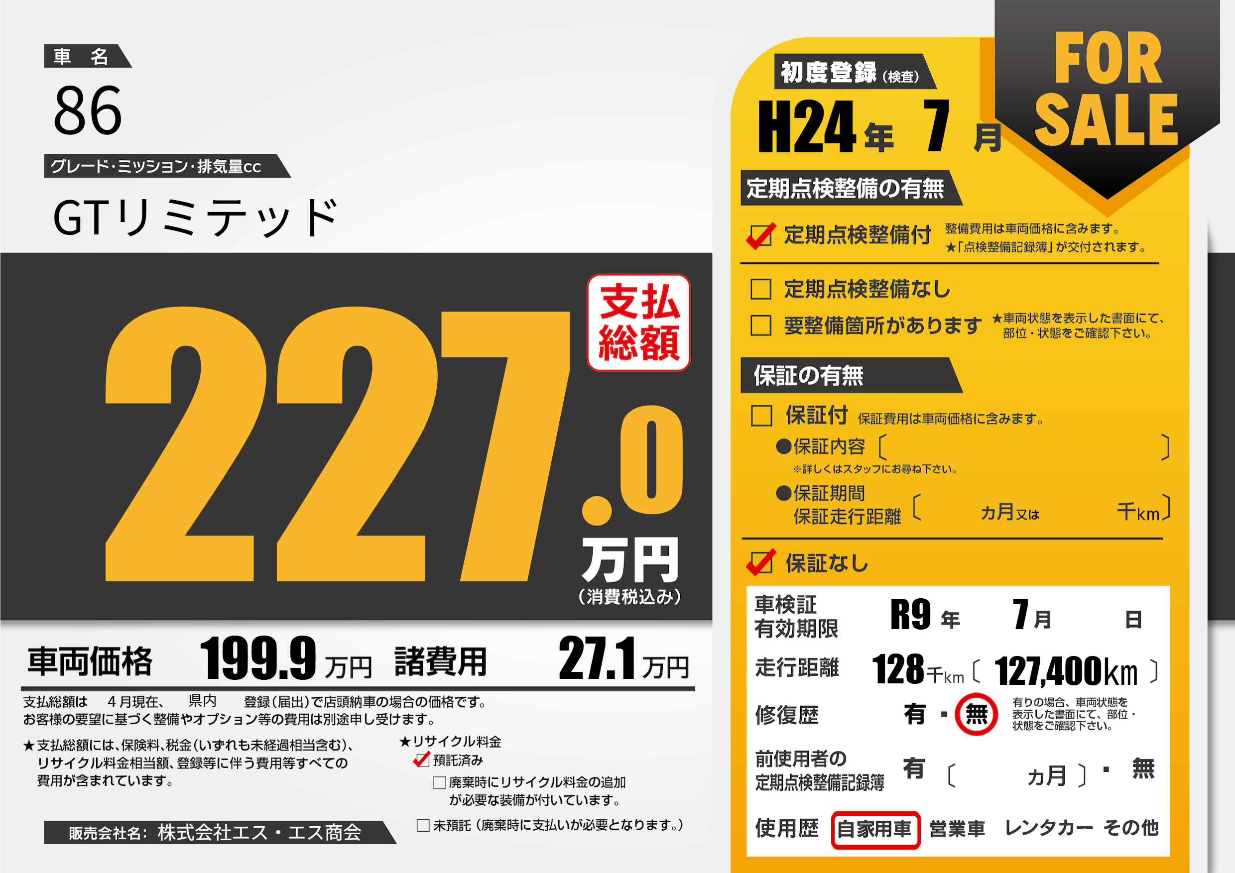 | 走行キロ | 12.8万km | 初年度登録 | H24年7月 |