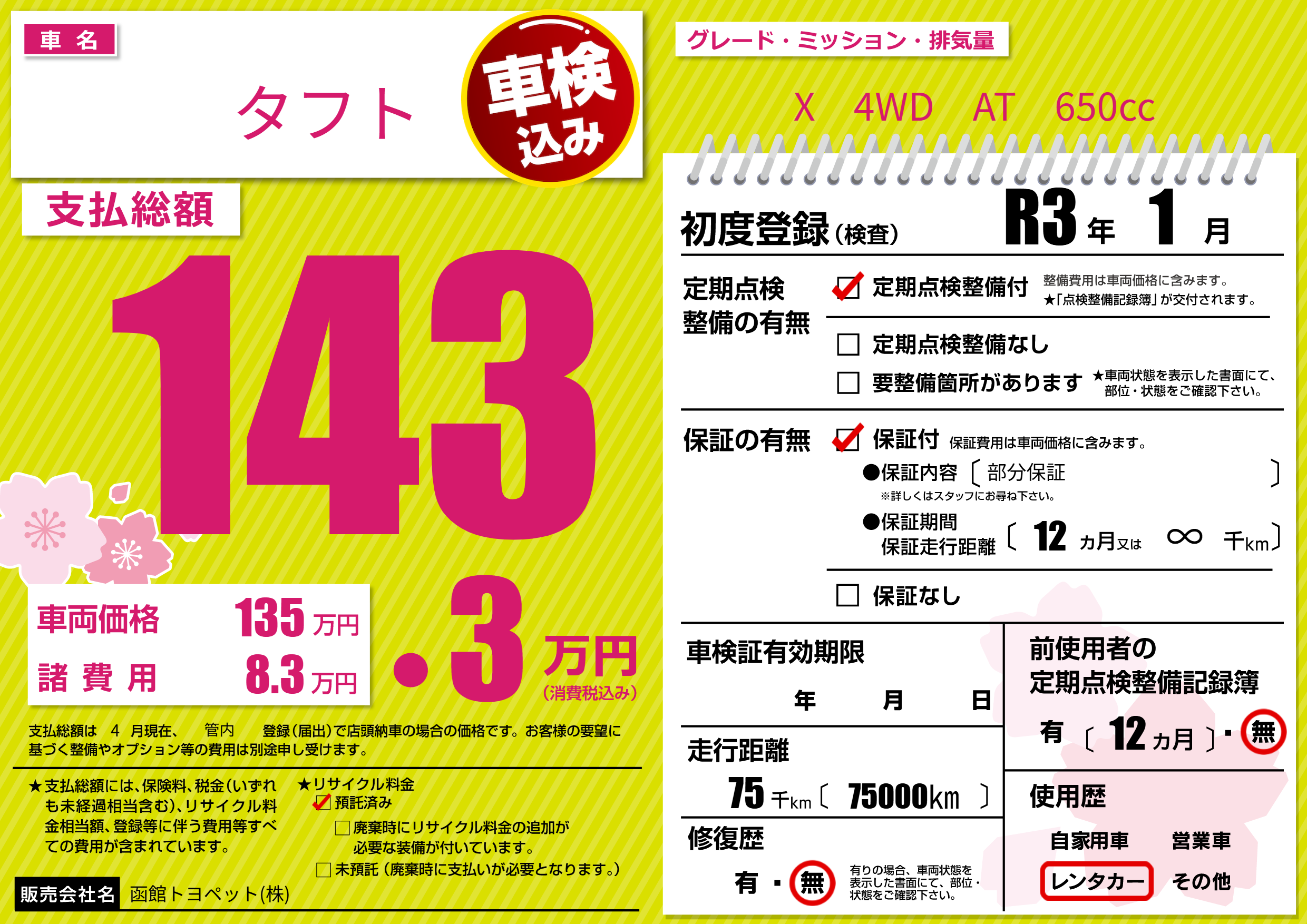 | 走行キロ | 7.5万km | 初年度登録 | R3年1月 |