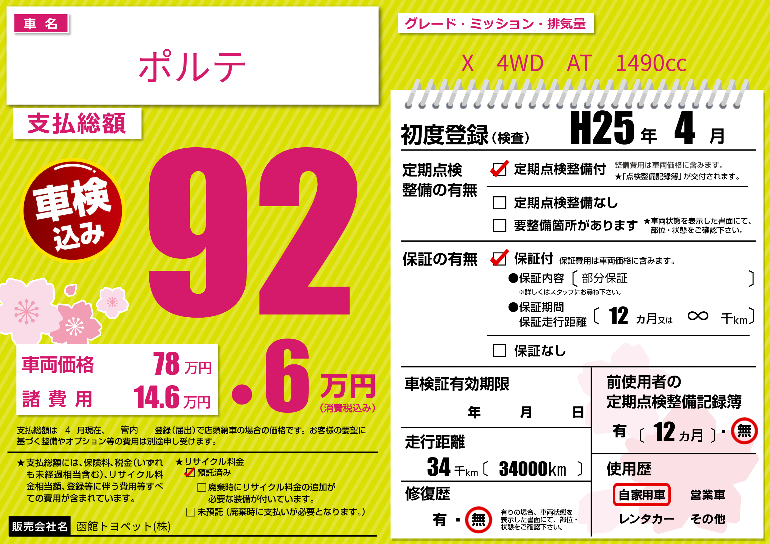 | 車名 | ポルテ | グレード ミッション 排気量 |