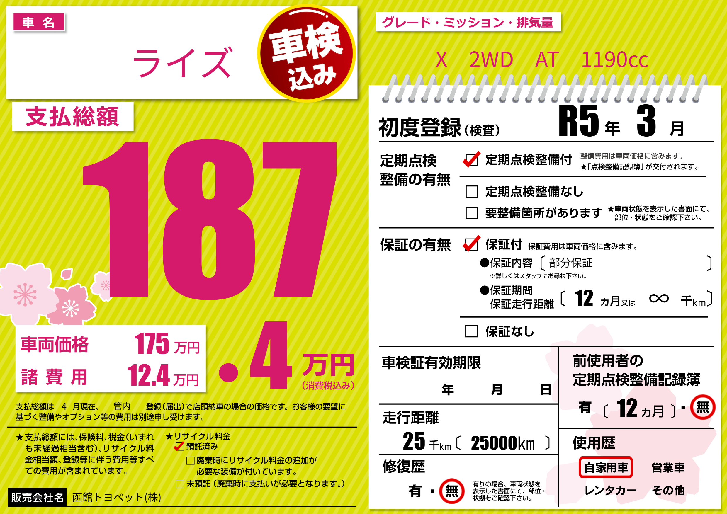 | 車名 | ライズ | グレード ミッション 排気量 |