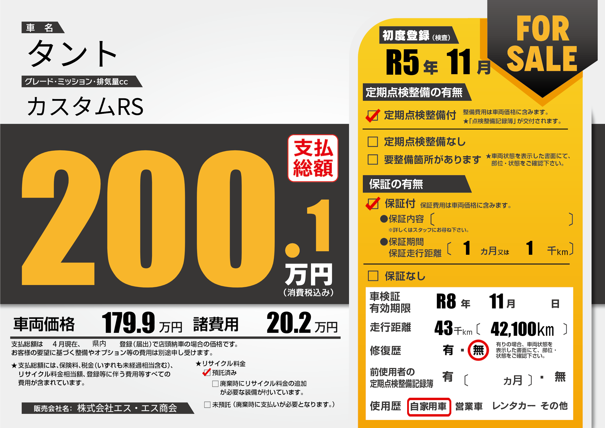 | 走行キロ | 4.3万km | 初年度登録 | R5年11月 |