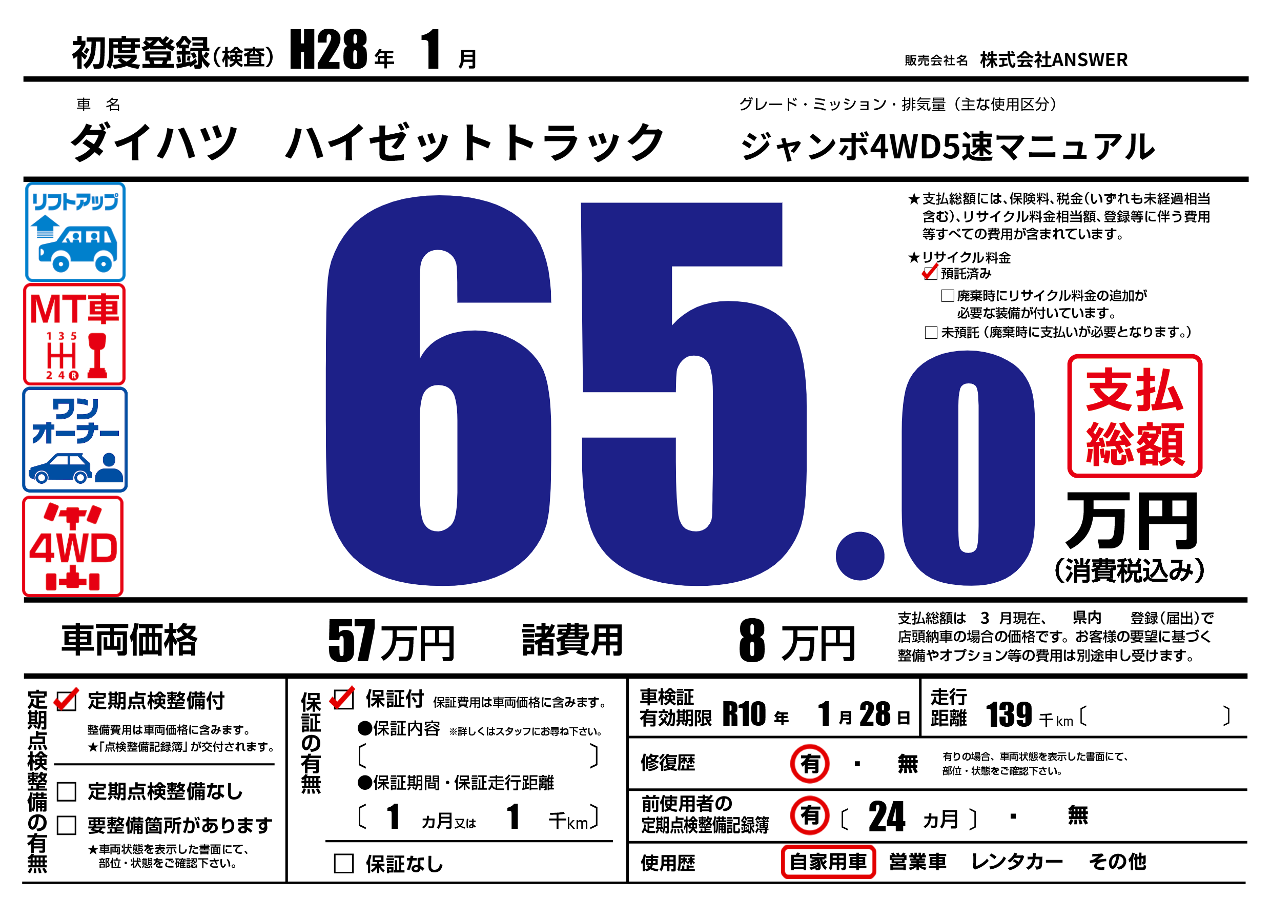 なし | 車検制限 | R10年1月28月 |