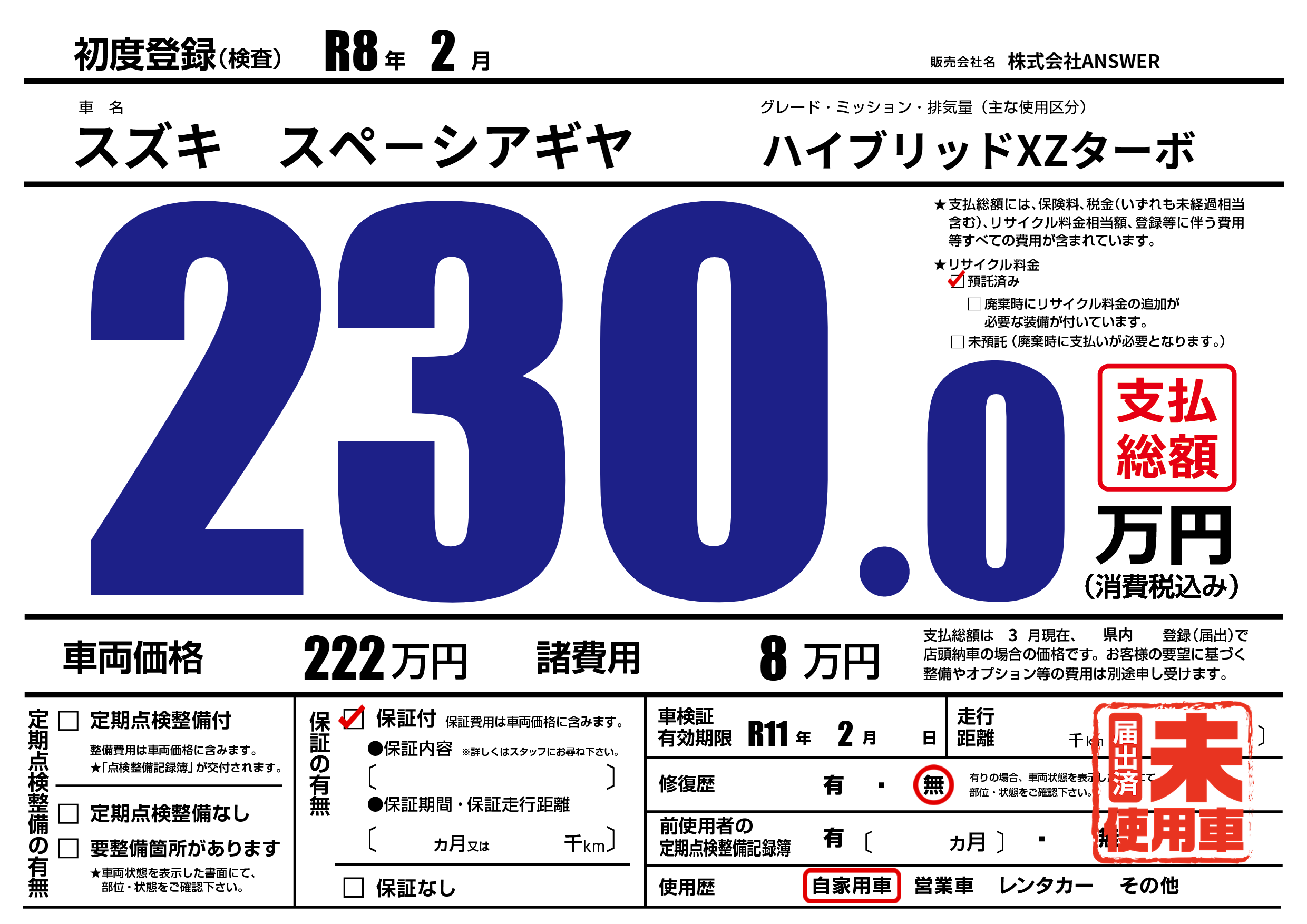 | 車検制限 | R11年 2月 - 日 | ||