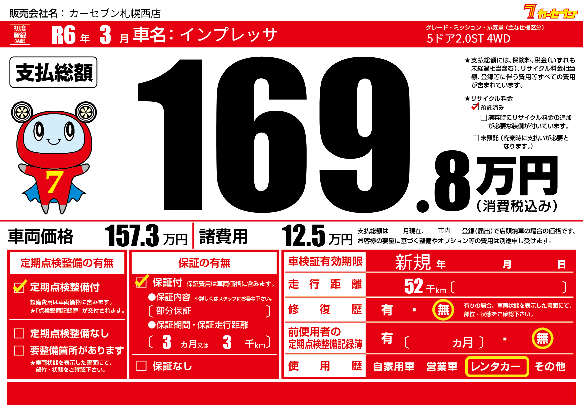 保証付き 保証内容(部分保証) 3ヶ月または(3)千kmまで |
