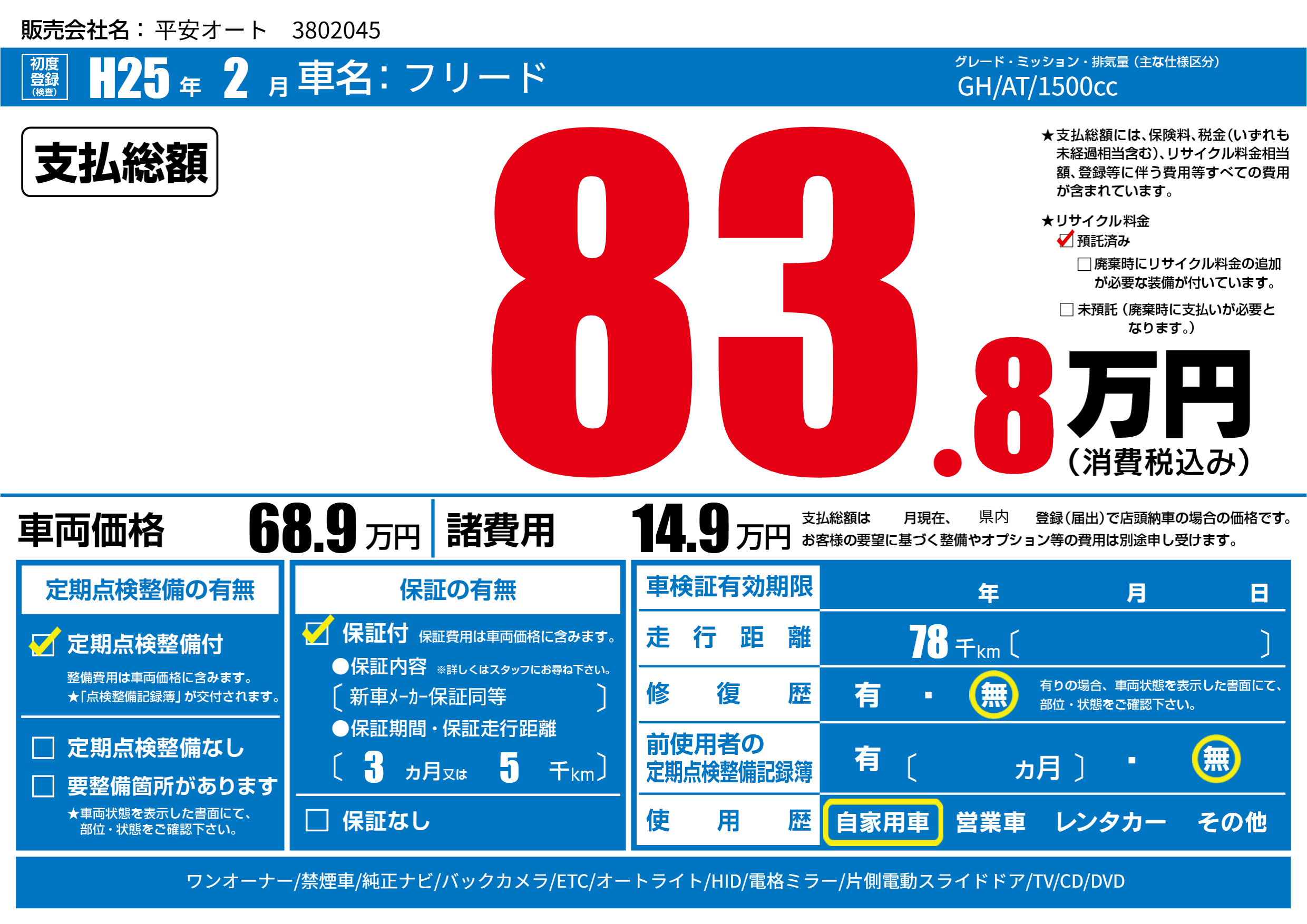 | 走行キロ | 7.8万km | 初年度登録 | H25年2月 |