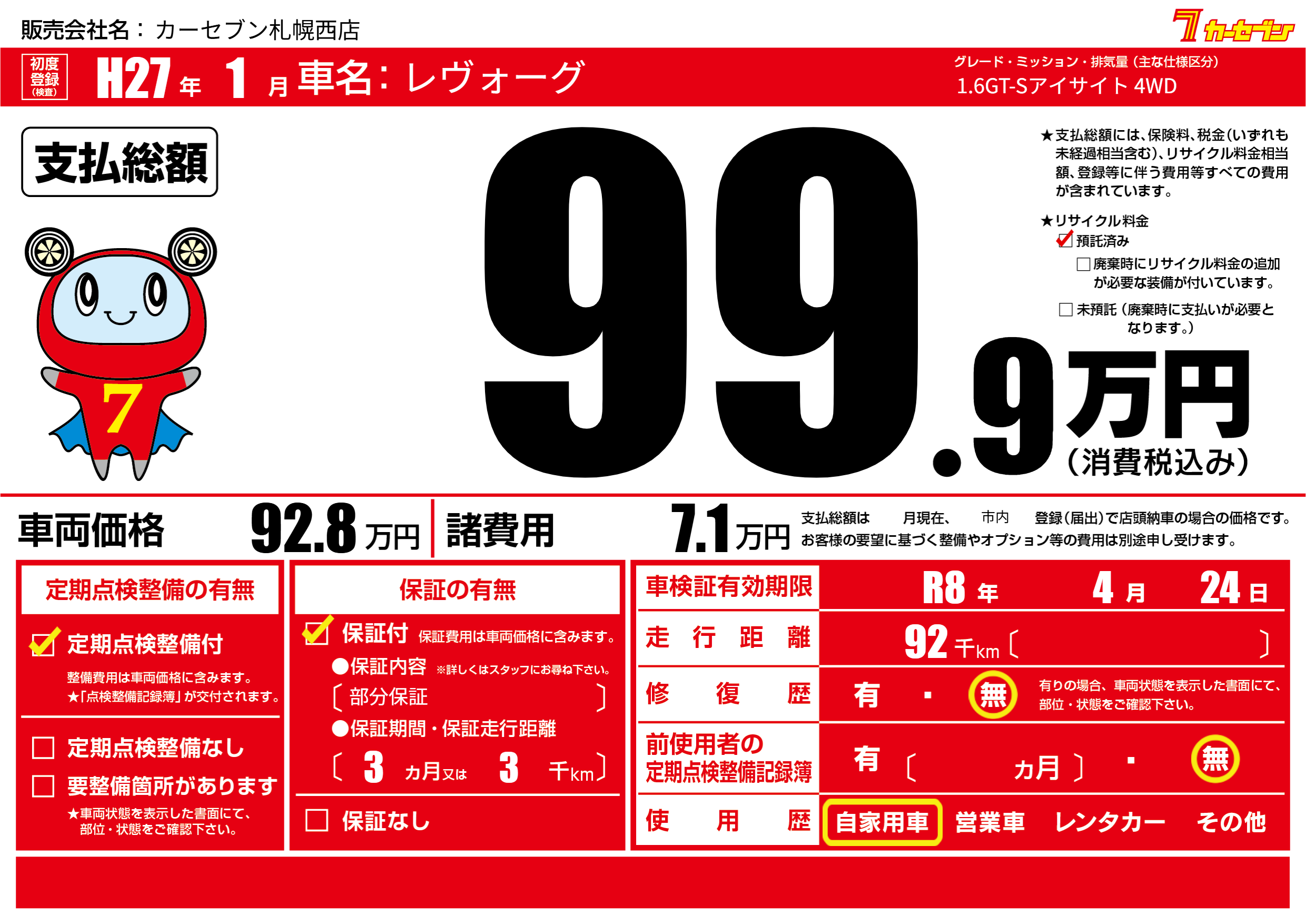 | 走行キロ | 9.2万km | 初年度登録 | H27年1月 |