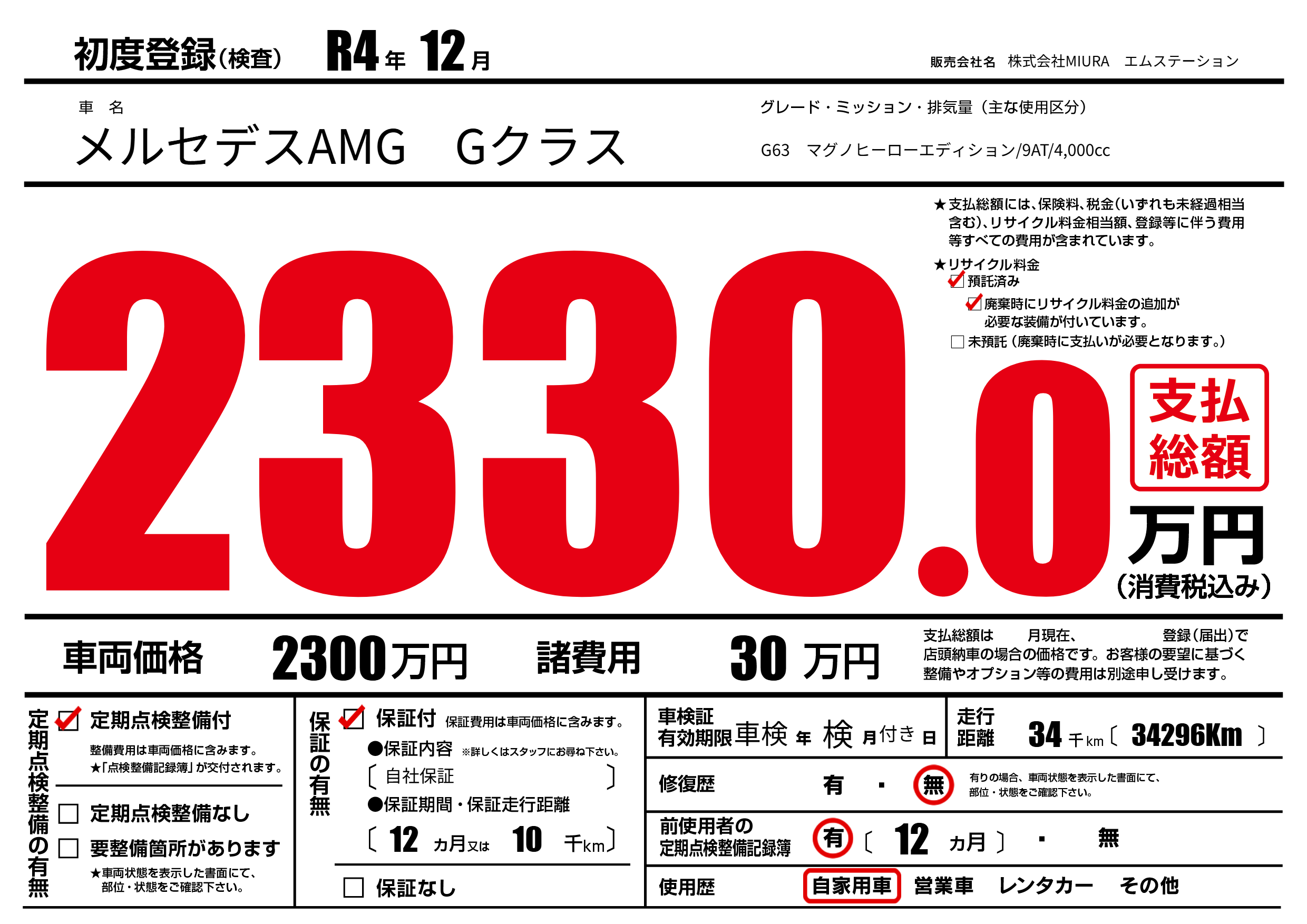 | 車名 | メルセデスAMG Gクラス | グレード ミッション 排気量 |