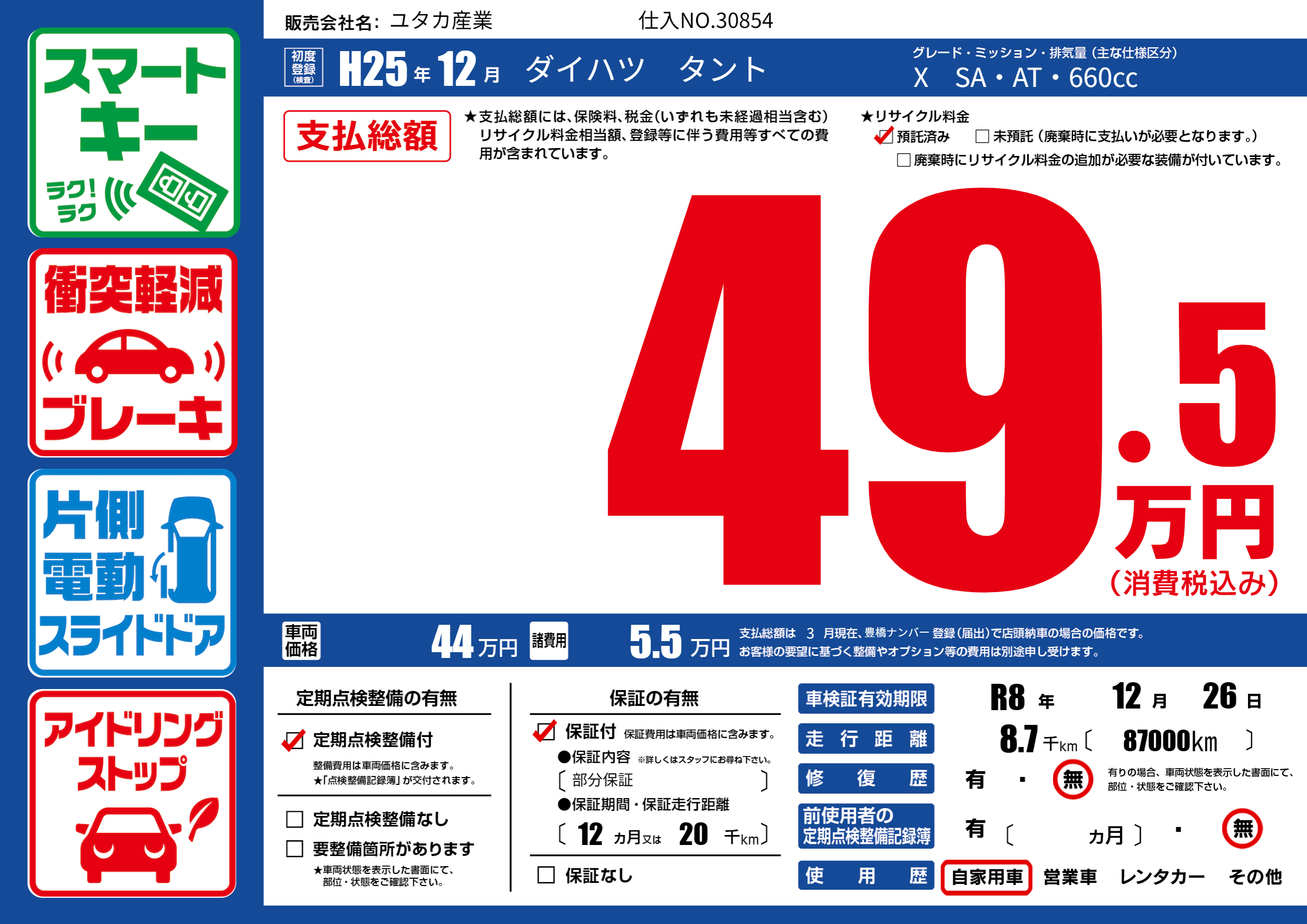 | 車名 | ダイハツ タント | グレード ミッション 排気量 |