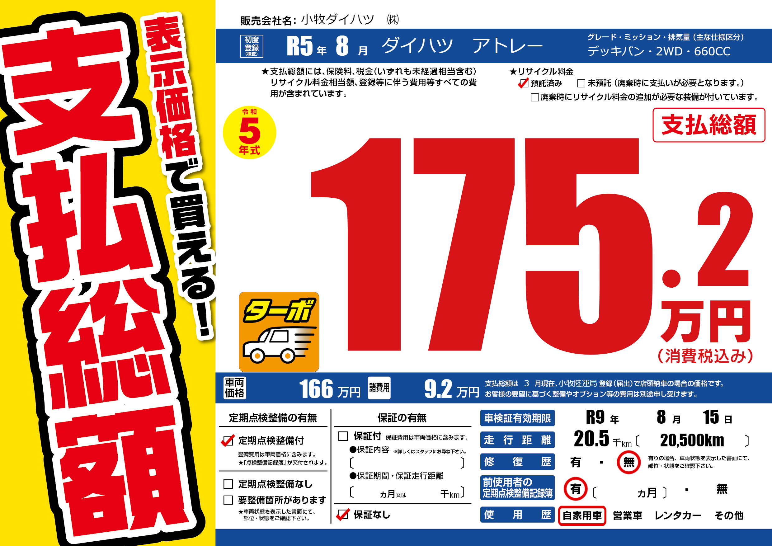 | 車名 | ダイハツ アトレー | グレード ミッション 排気量 |