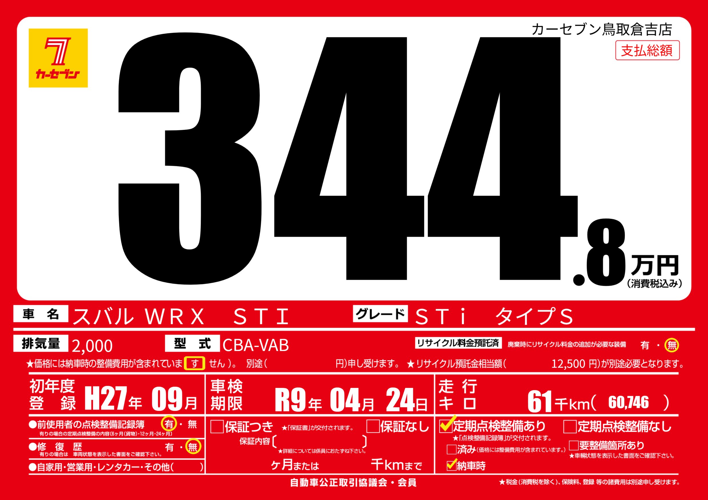 | 車名 | スバル WRX STI | グレード ミッション 排気量 |