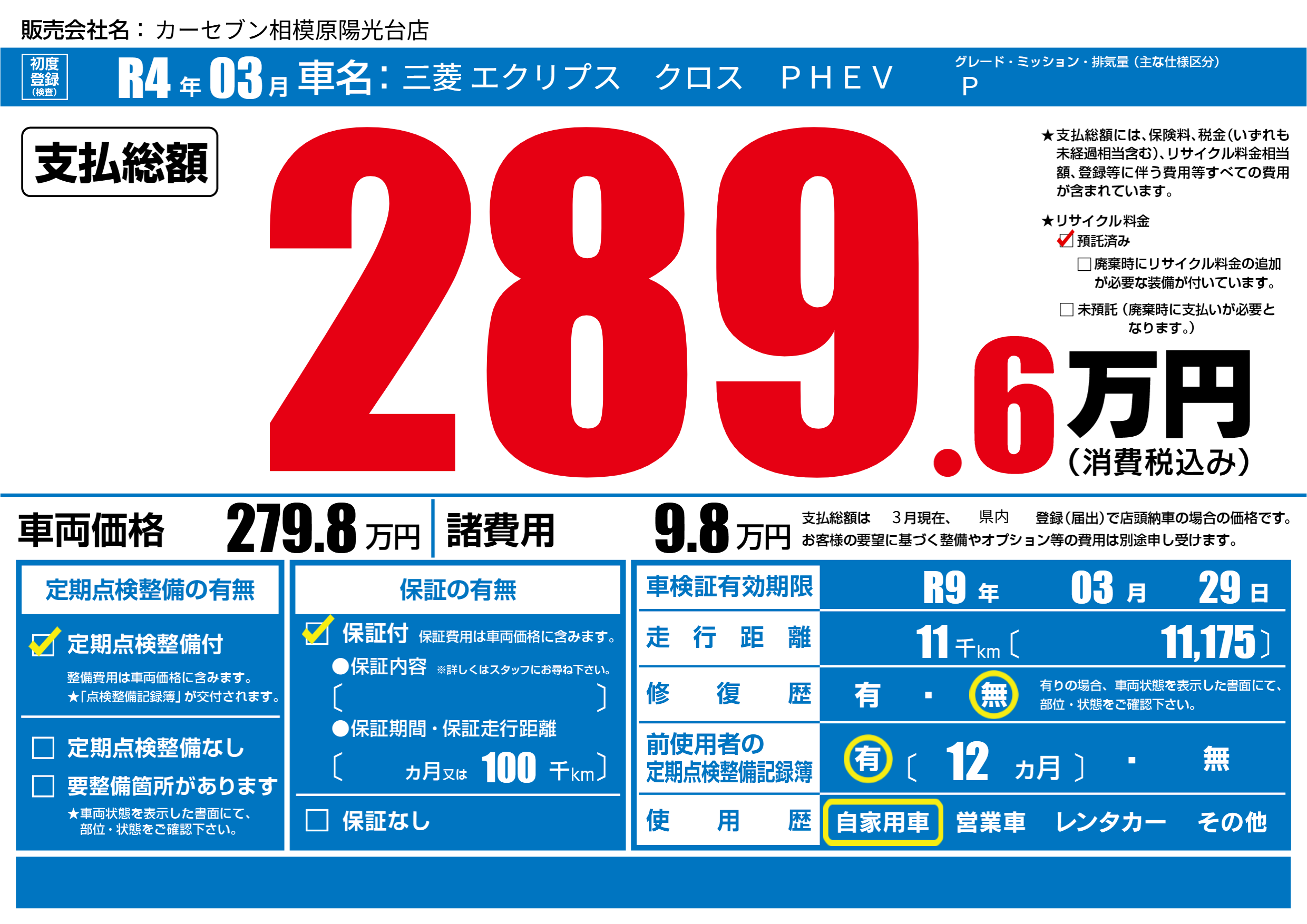 | 車名 | 三菱 エクリプス クロス PHEV | グレード ミッション 排気量 |
