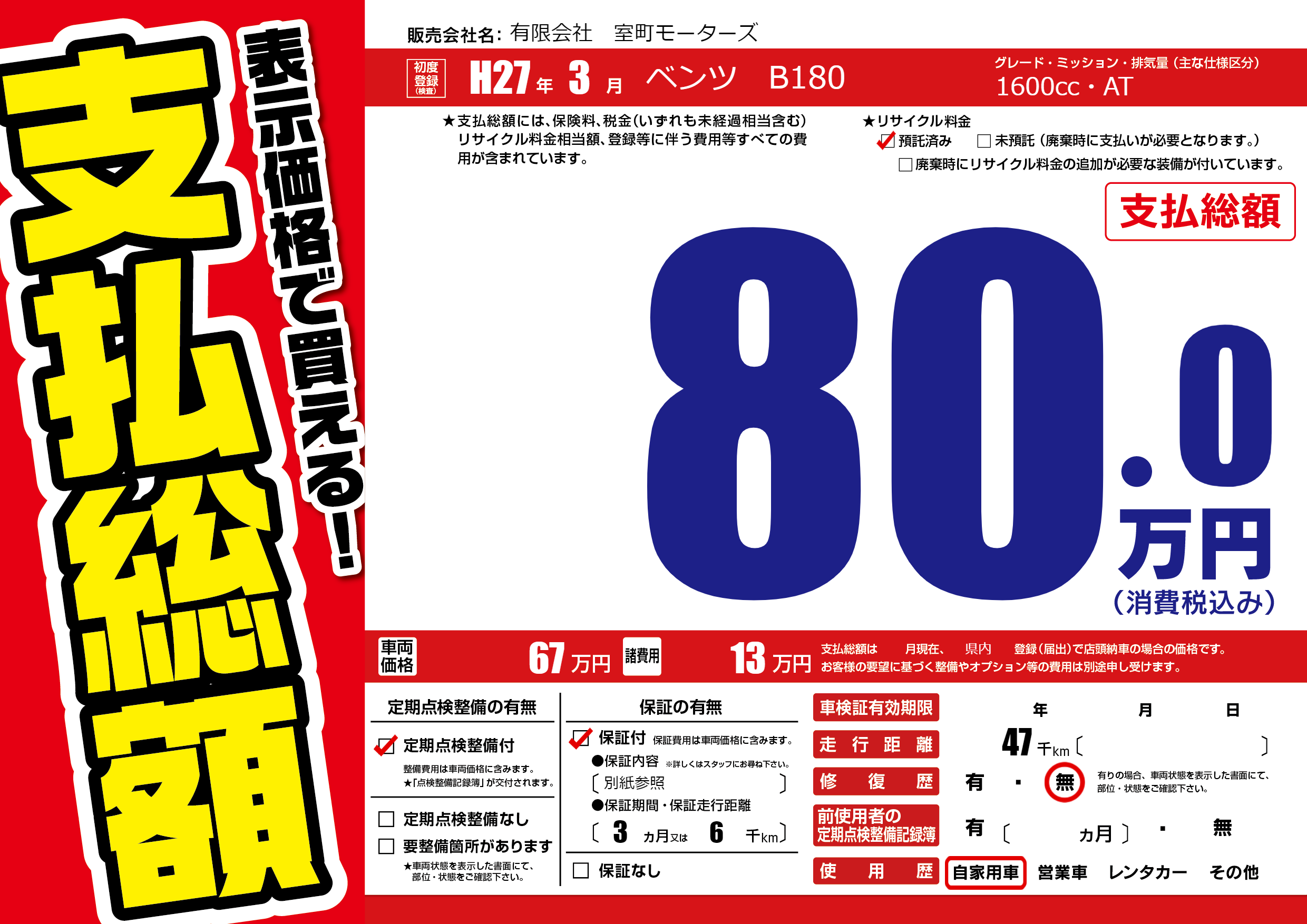 | 車名 | ベンツ B180 | グレード ミッション 排気量 |