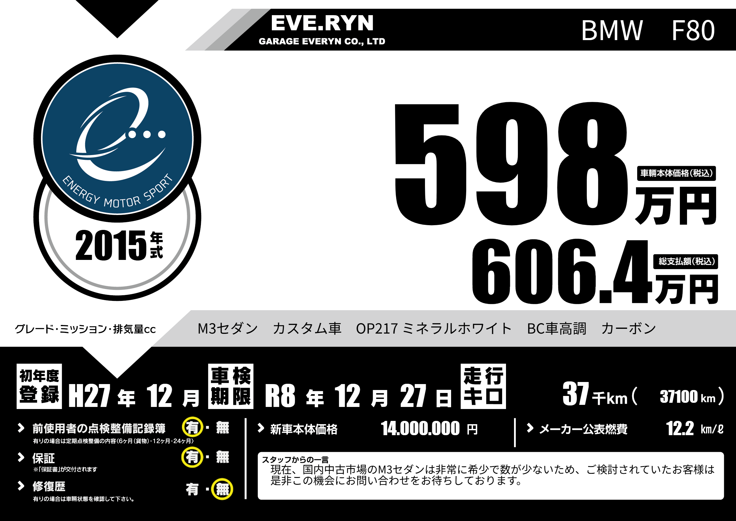 | 車名 | BMW F80 | グレード ミッション 排気量 |